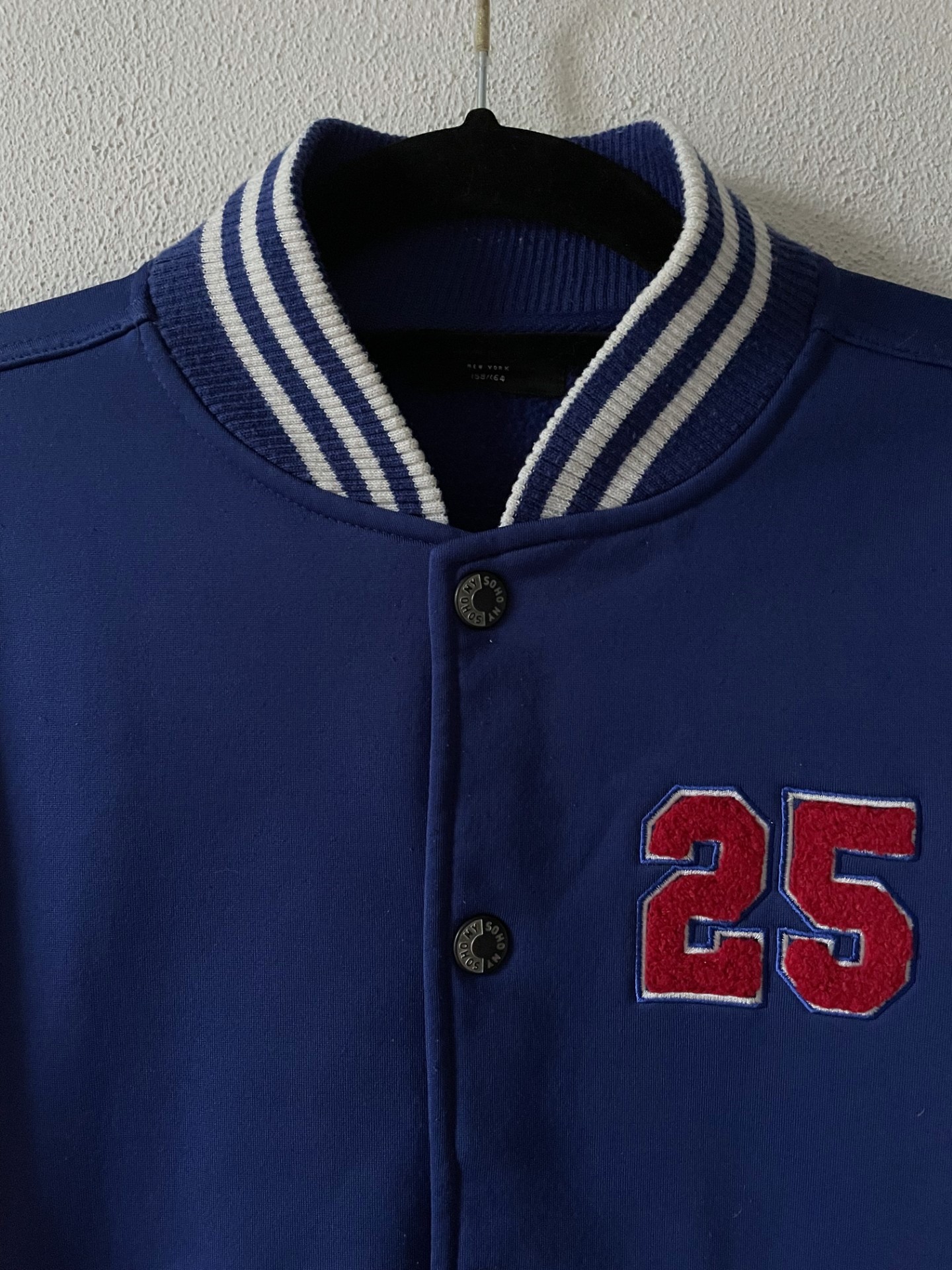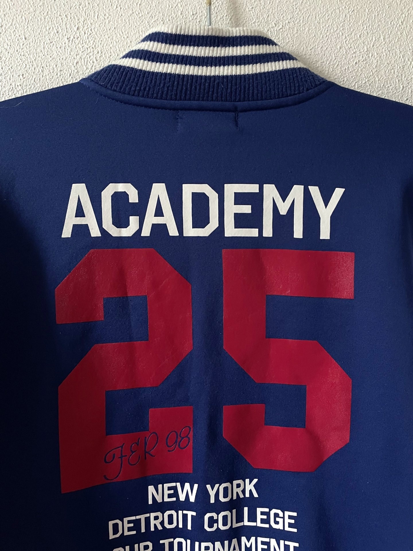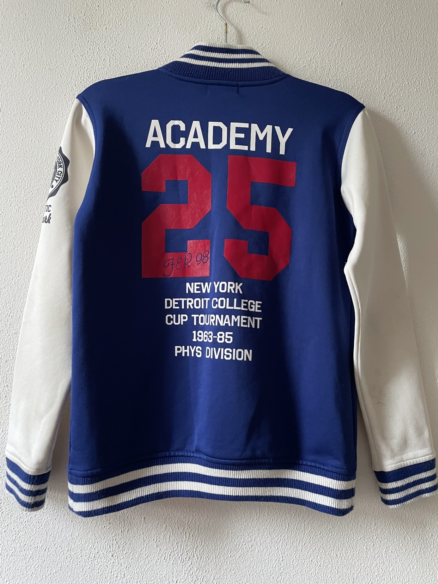 Baseball vest in kobalt en offwhite met rode backprint. Sluiting met drukknopen.