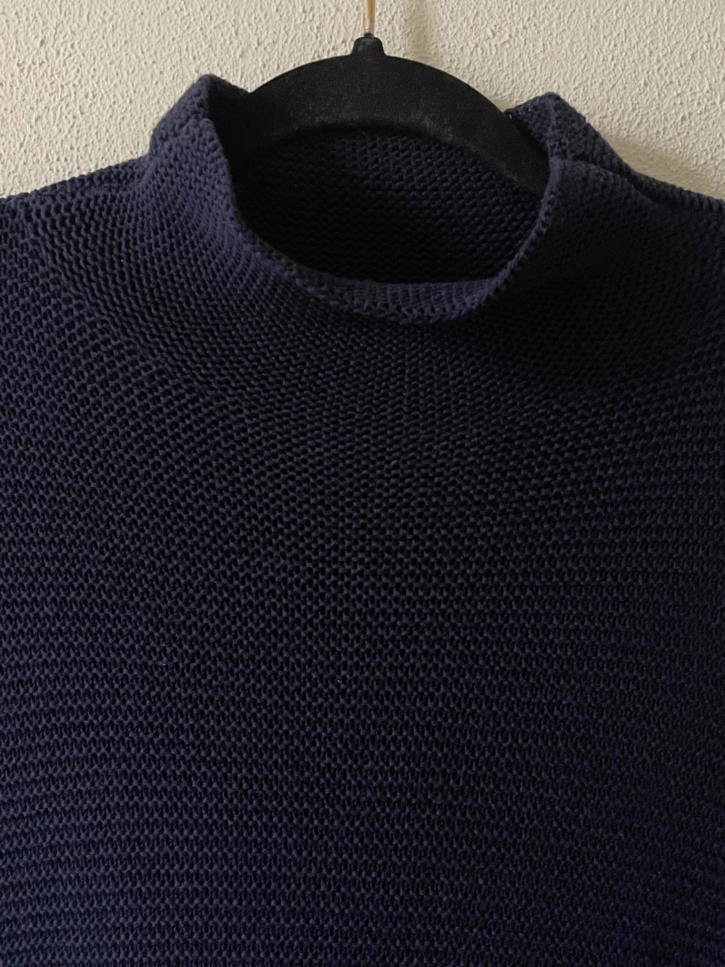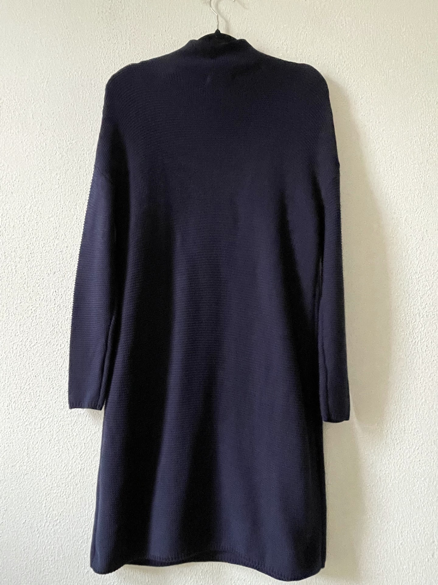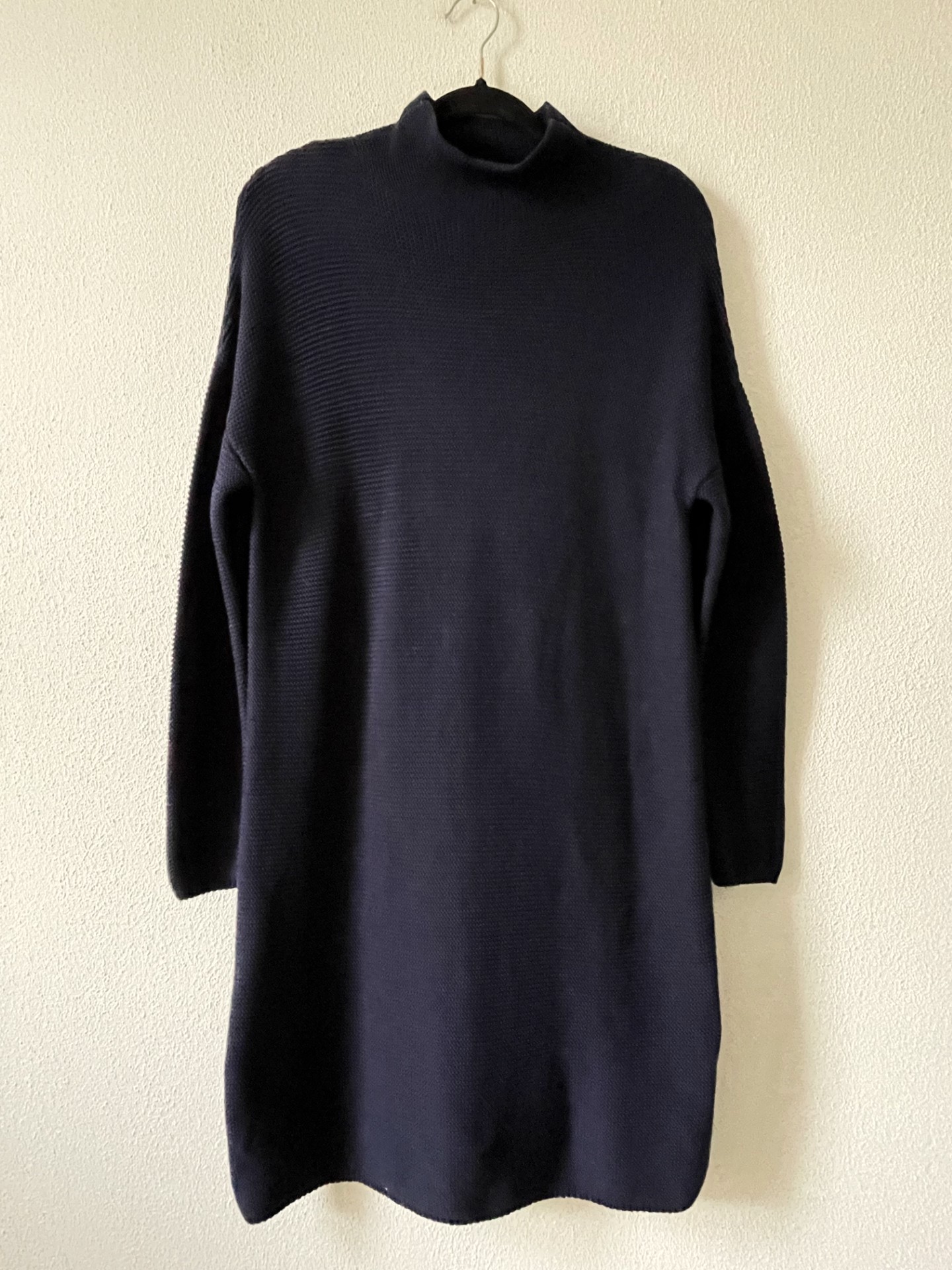 Donkerblauwe gebreide jurk met lange mouwen aan turtle neck. Van 50% katoen en 50% acryl.