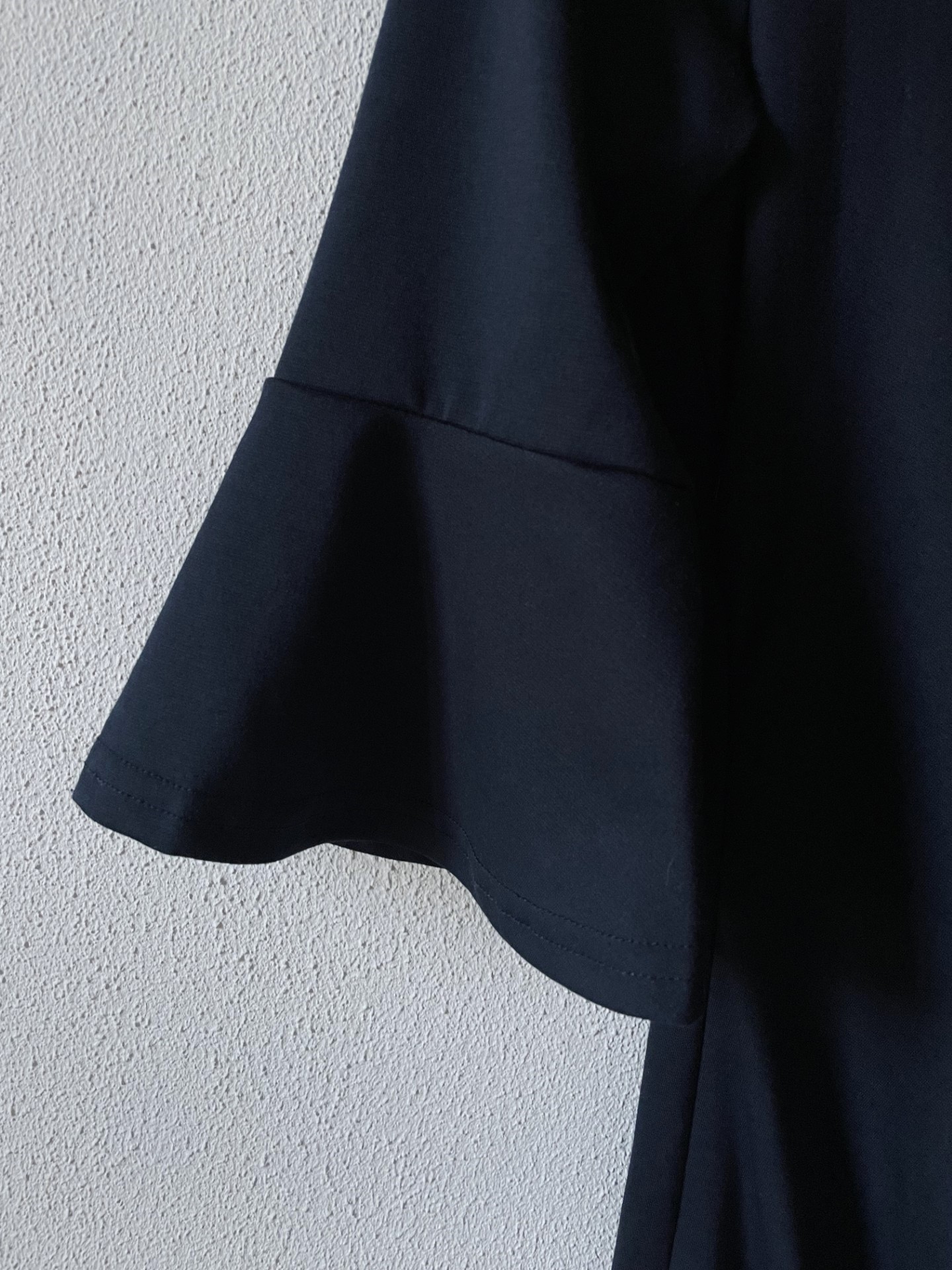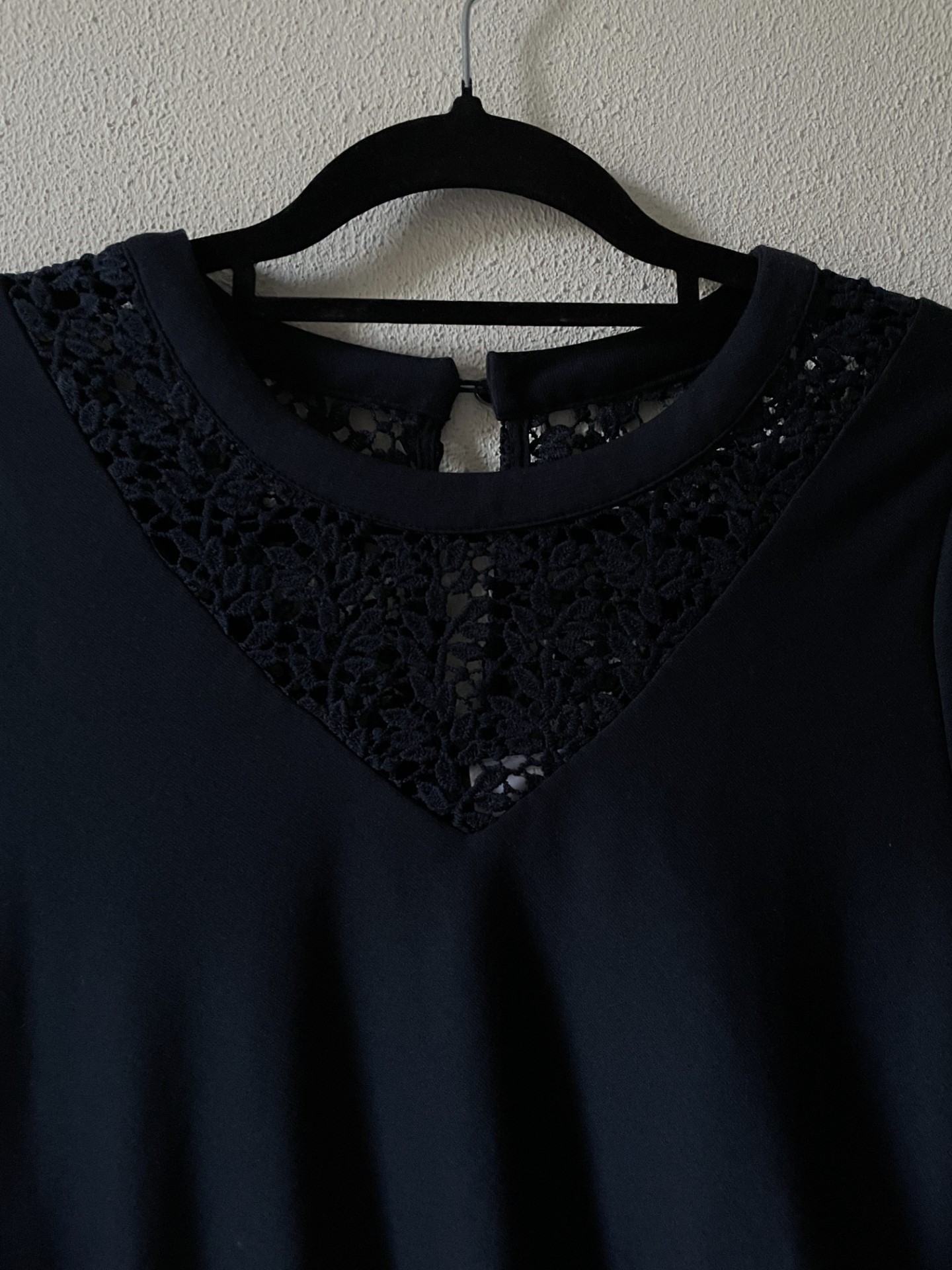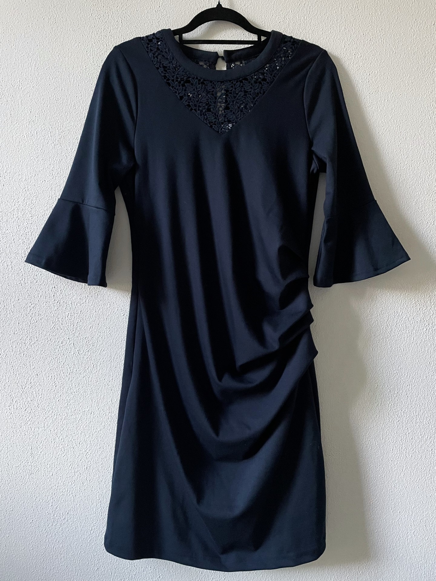 Donkerblauwe jurk met opengewerkte hals en nek met draperie in de taille en driekwart trompetmouwen. De jurk is gevoerd en de lengte is ongeveer 100 cm. Van polyester, viscose en elastan.