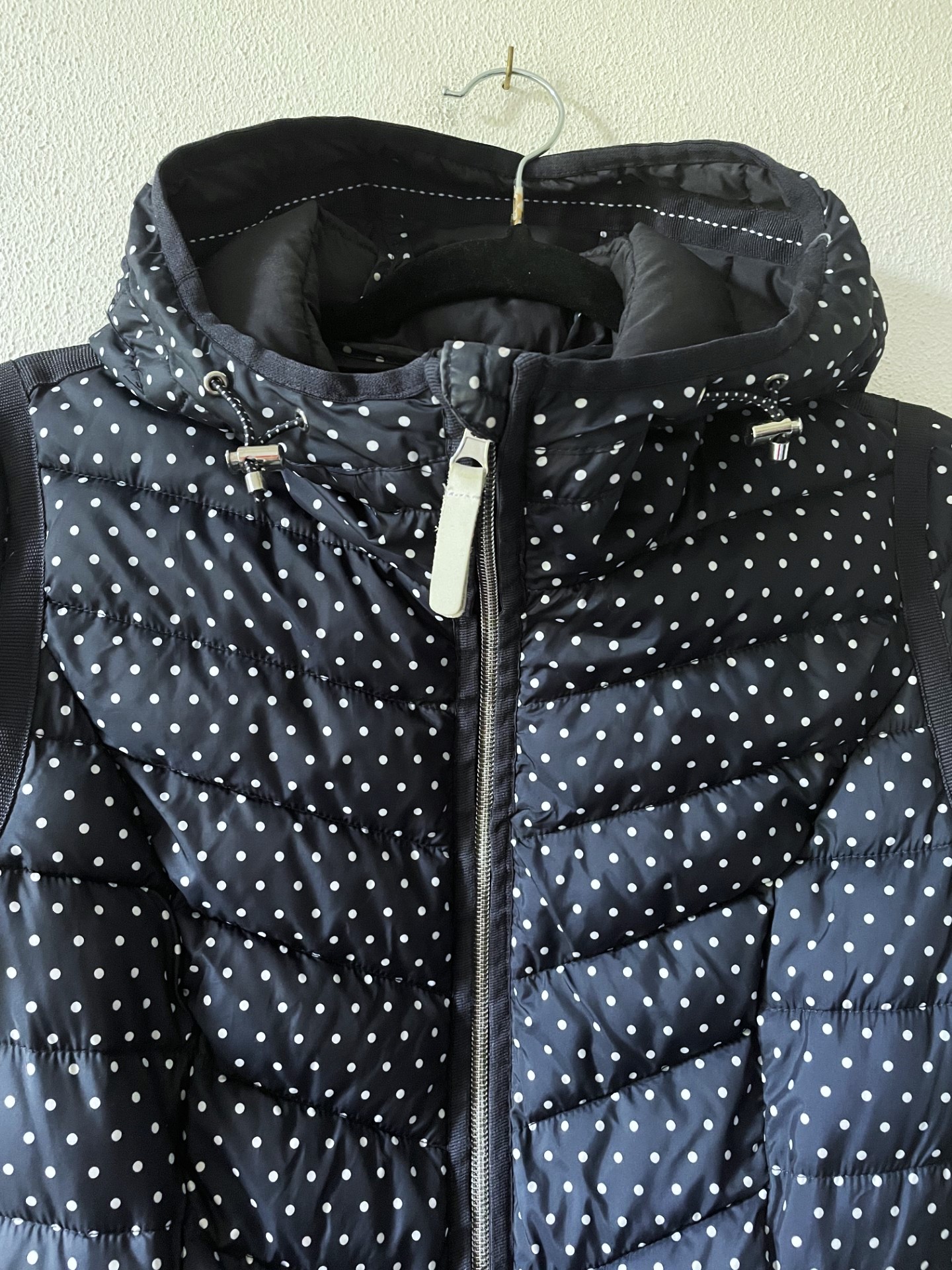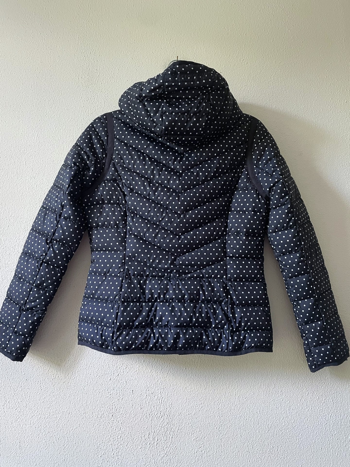 Donkerblauwe gewatteerde jas met witte stippen en capuchon. Mooi afgewerkt met sierlijke ritsen. Het is een dunnere jas, geschikt als tussenjas. Maatlabel geeft S aan, valt iets ruimer (S/M).