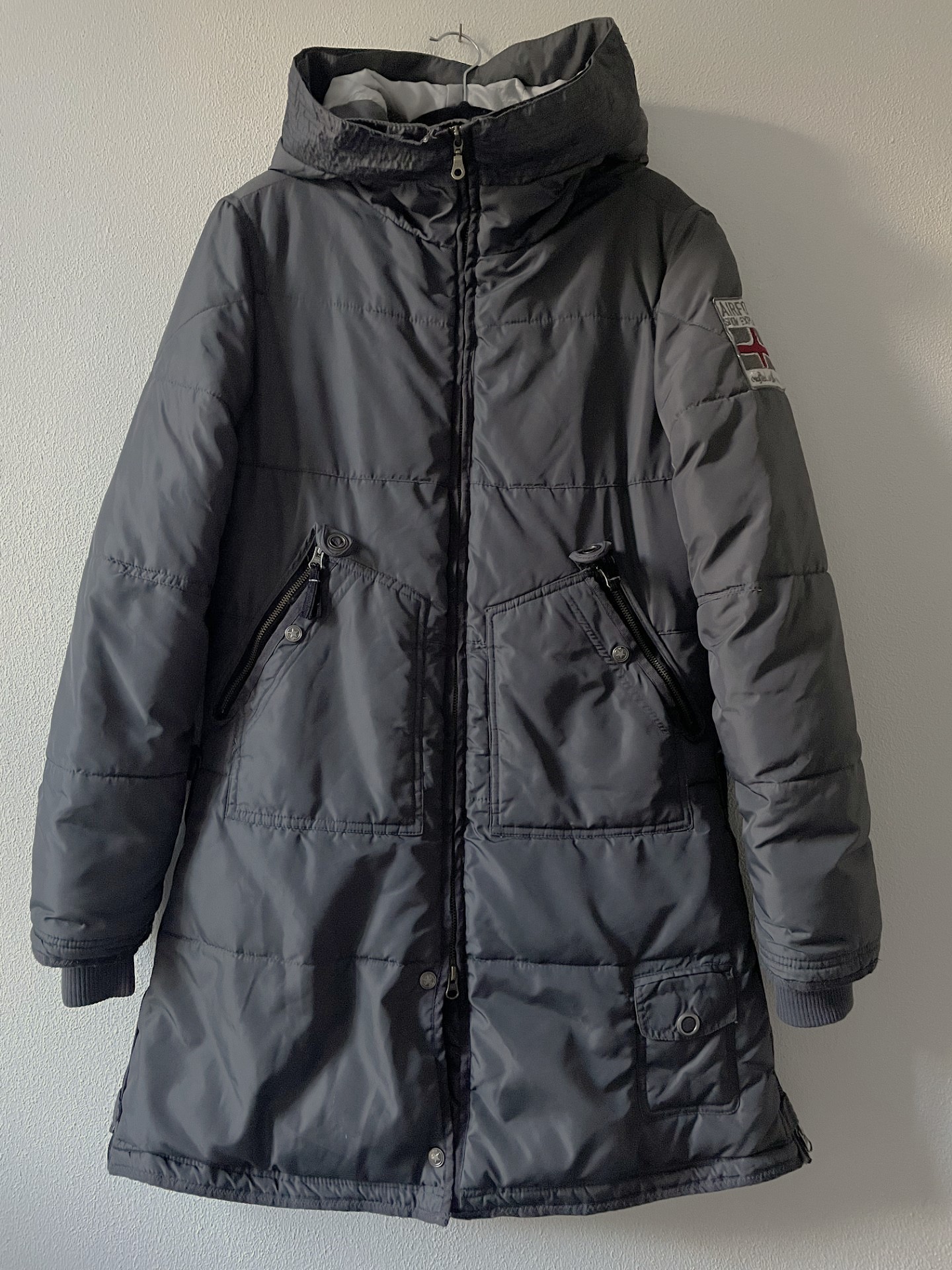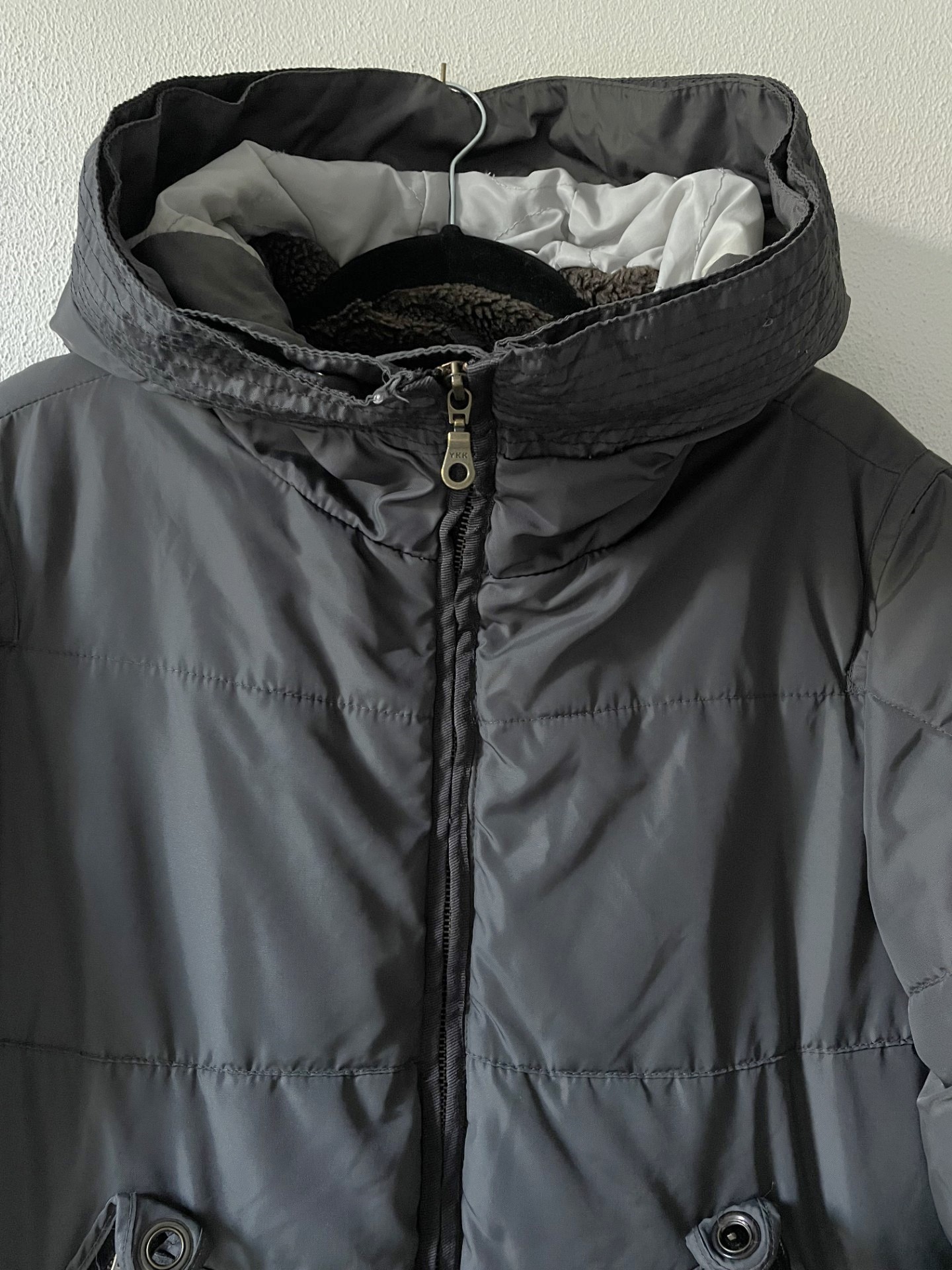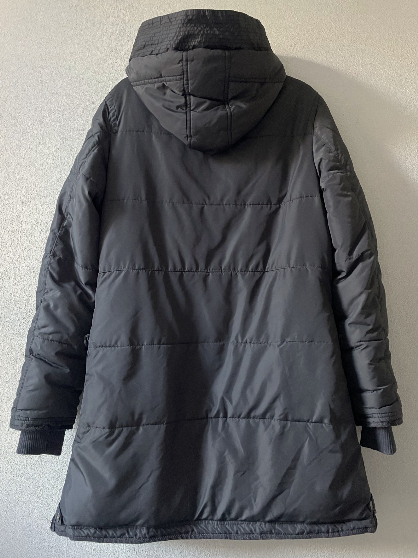 Lange pufferjas in donkergrijze kleur met capuchon met boorden onderaan de mouwen. Er zit een lichtbruin bontrandje los bij die aan de capuchon gezet kan worden. Valt iets kleiner (L/XL).