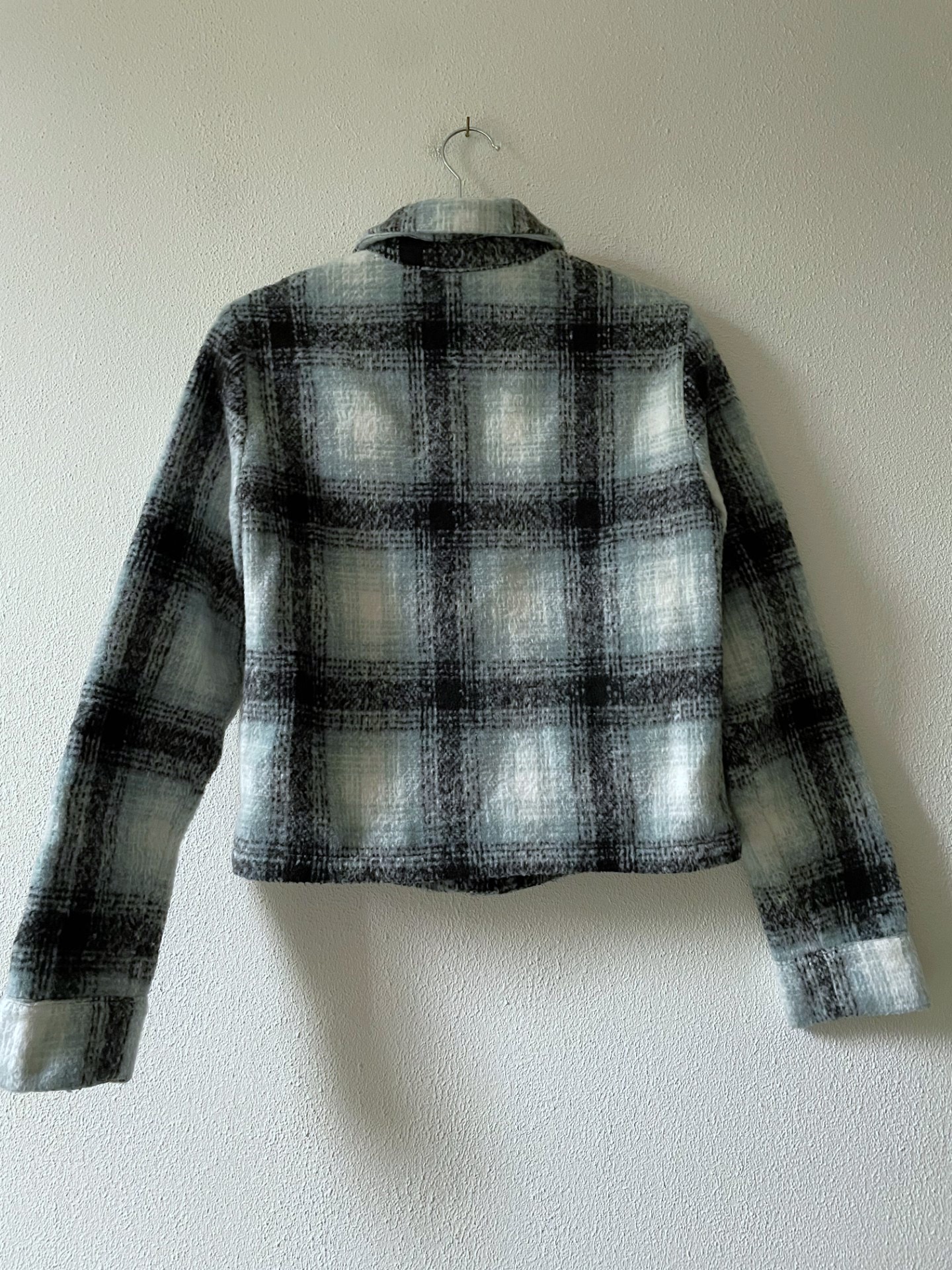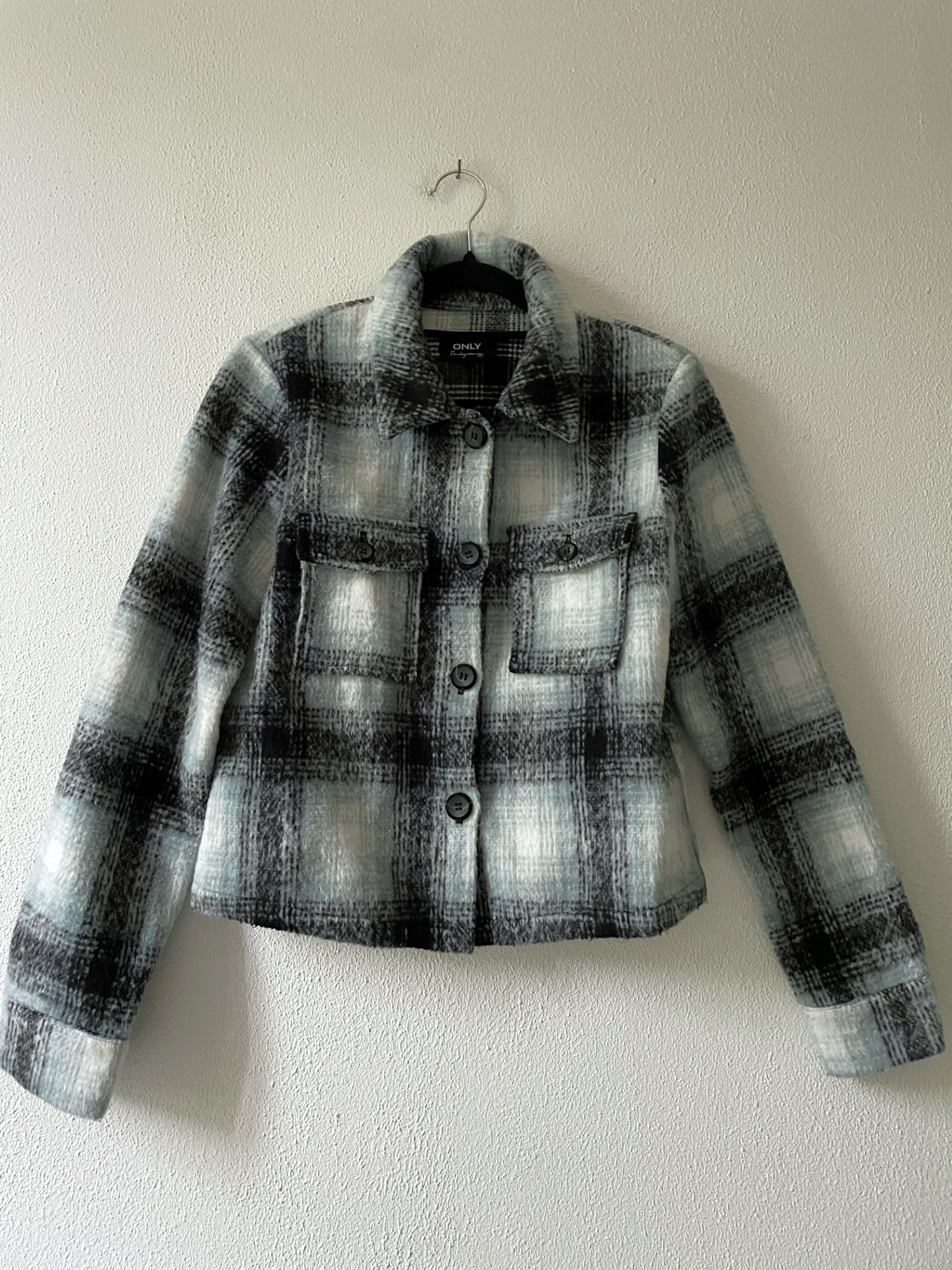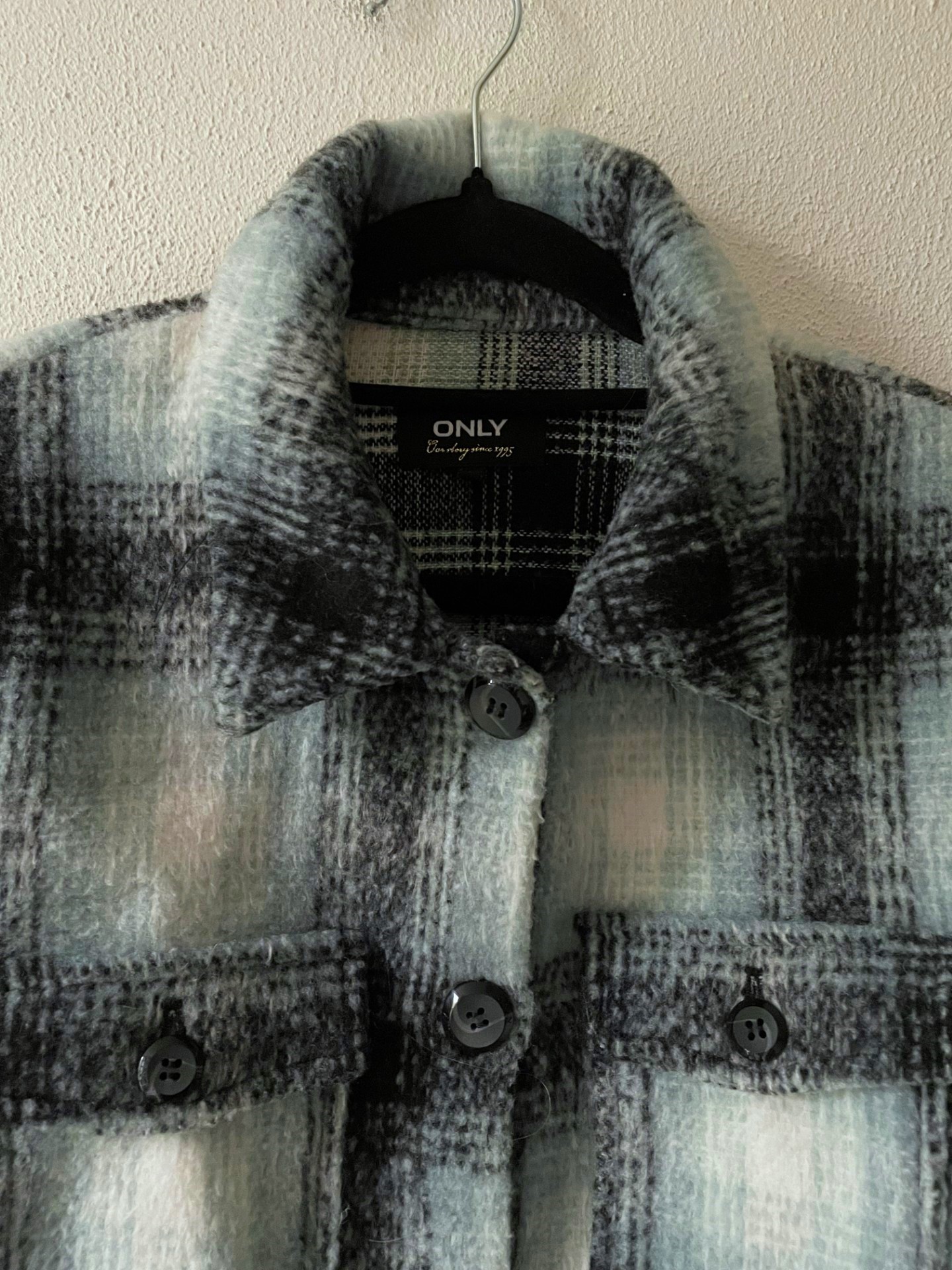 Geruit blousejasje in antraciet, mintgroen en offwhite met knopensluiting en 2 klepzakken voor. Voelt wollig en warm aan.