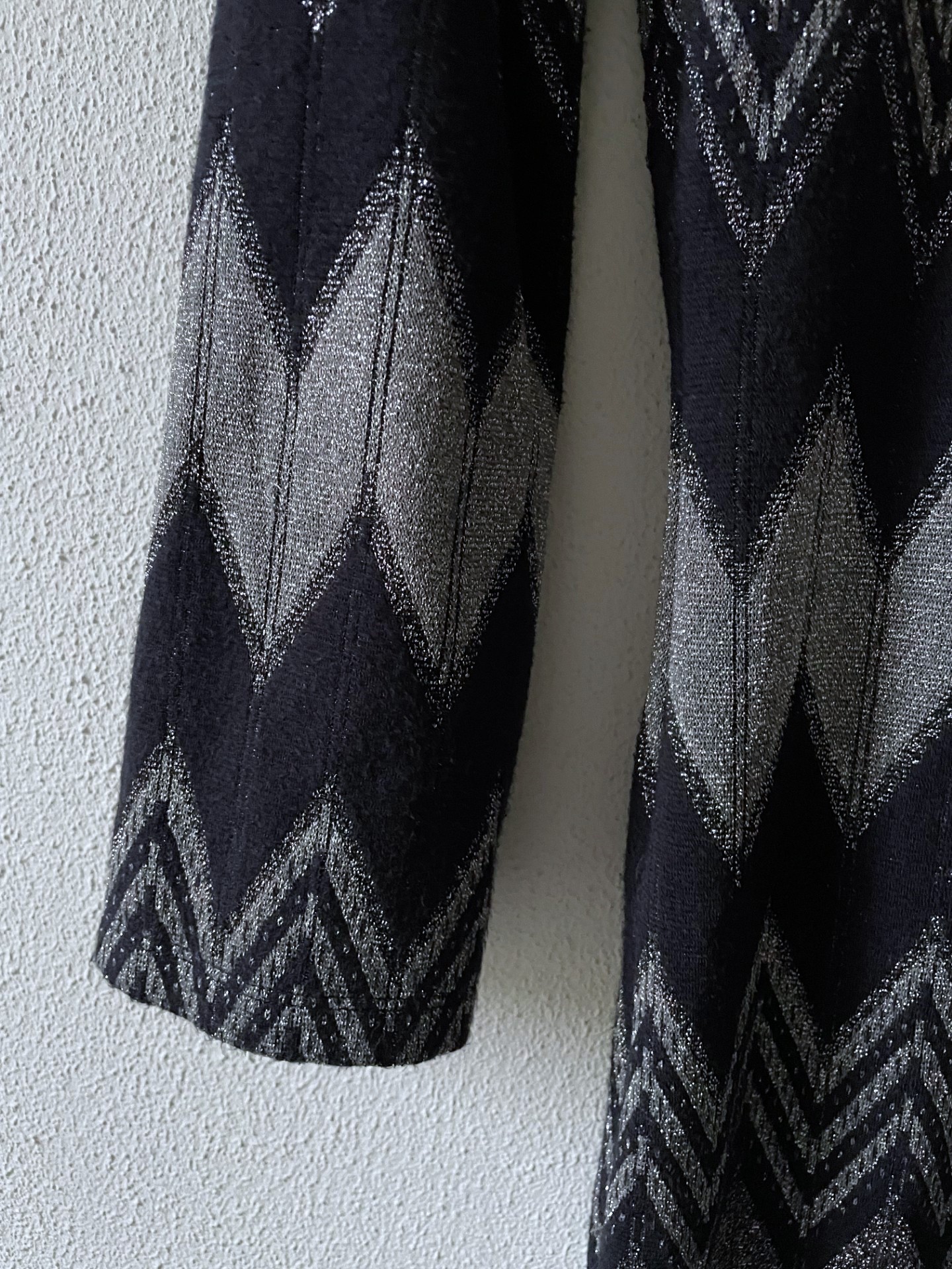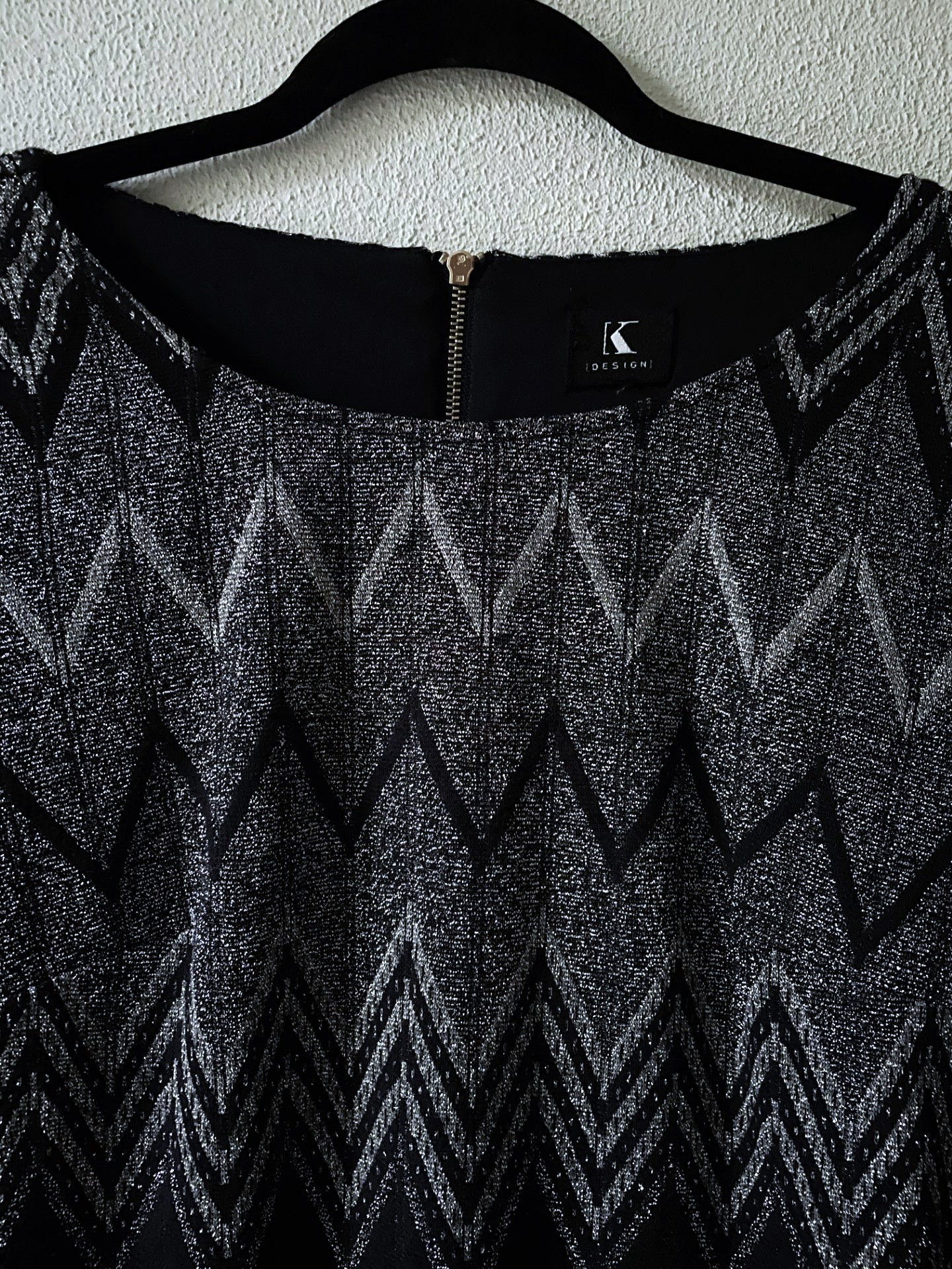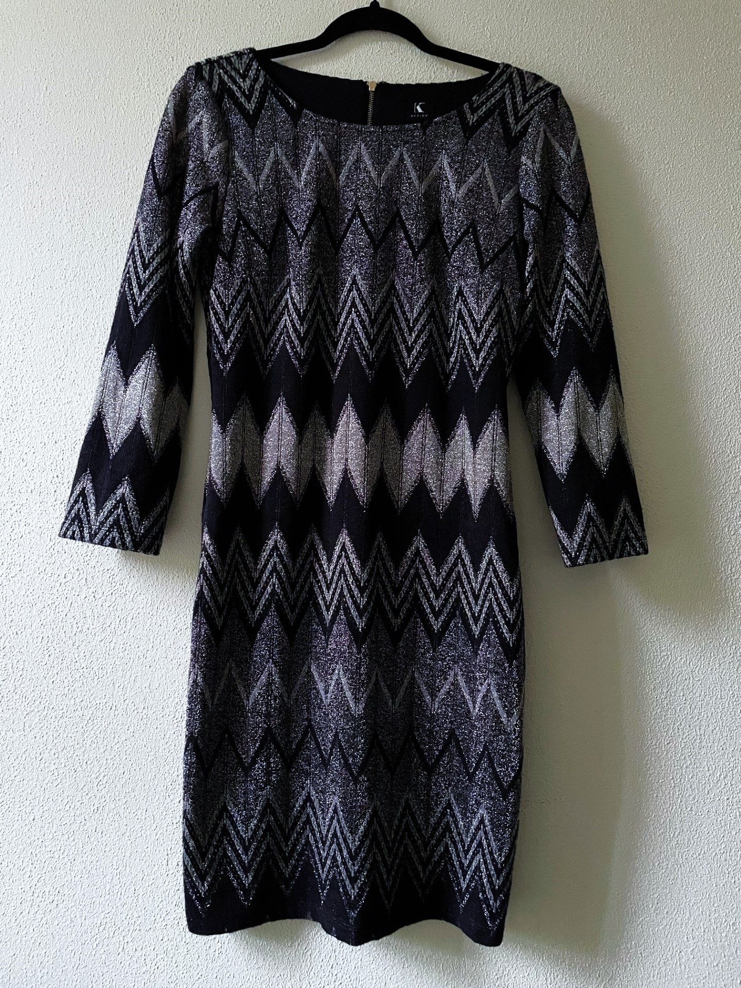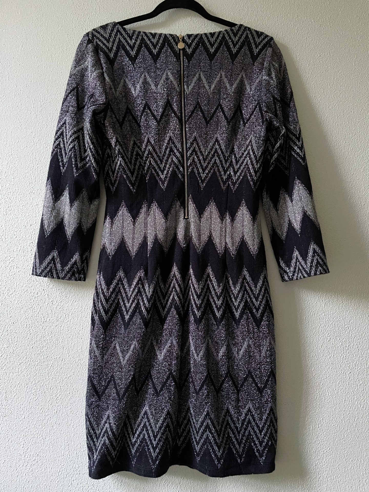 Feestelijke jurk van een donkerblauwe/zilverkleurige zigzag glitterstof. Op de foto is de glitter moeilijker te zien; al het zilvergrijze is van glitterstof. De jurk is helemaal gevoerd met een superzachte polyester die voelt als viscose (ook in de mouwen). Heeft geen maatlabel maar lijkt een maat EU38 te zijn (schouderbreedte is 38 cm). Lengte is 92 cm.