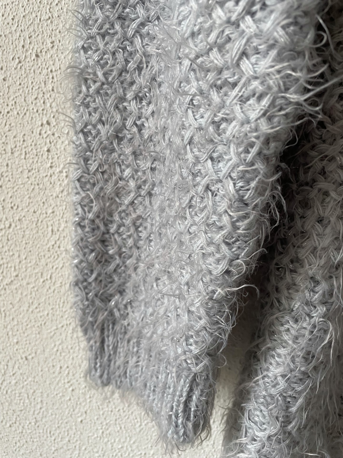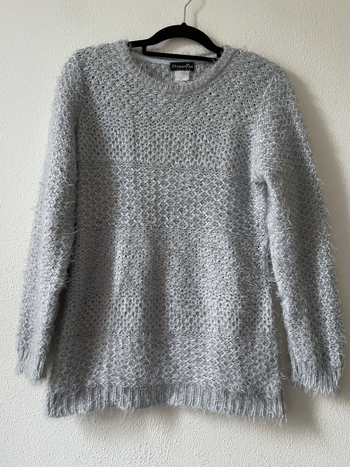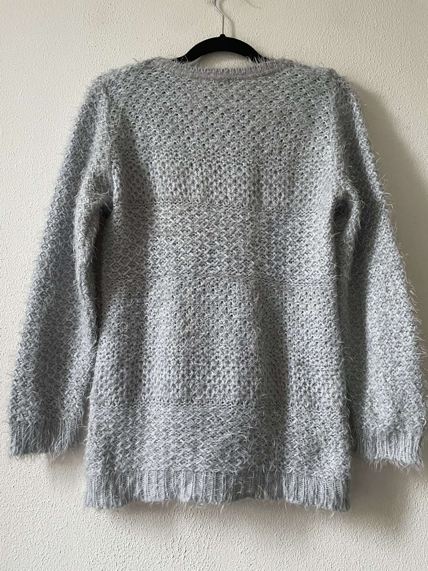 Grijze gebreide zachte trui met subtiele glitterdraad. Van 58% acryl, 39% polyamide en 3% metaaldraad. Geen maatlabel, geschat op een M. Schouderbreedte 40 cm, borst 60 cm, lengte 69 cm.