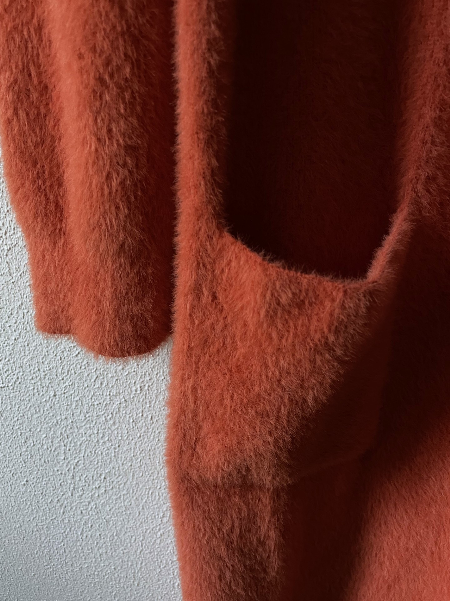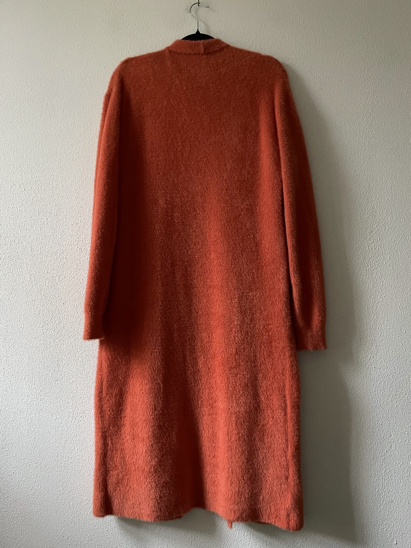 Lang vest van een super zachte oranje mooie kwaliteit garen. Zonder sluiting en met steekzakken. Heerlijk warm. Valt vrij ruim (M/L).