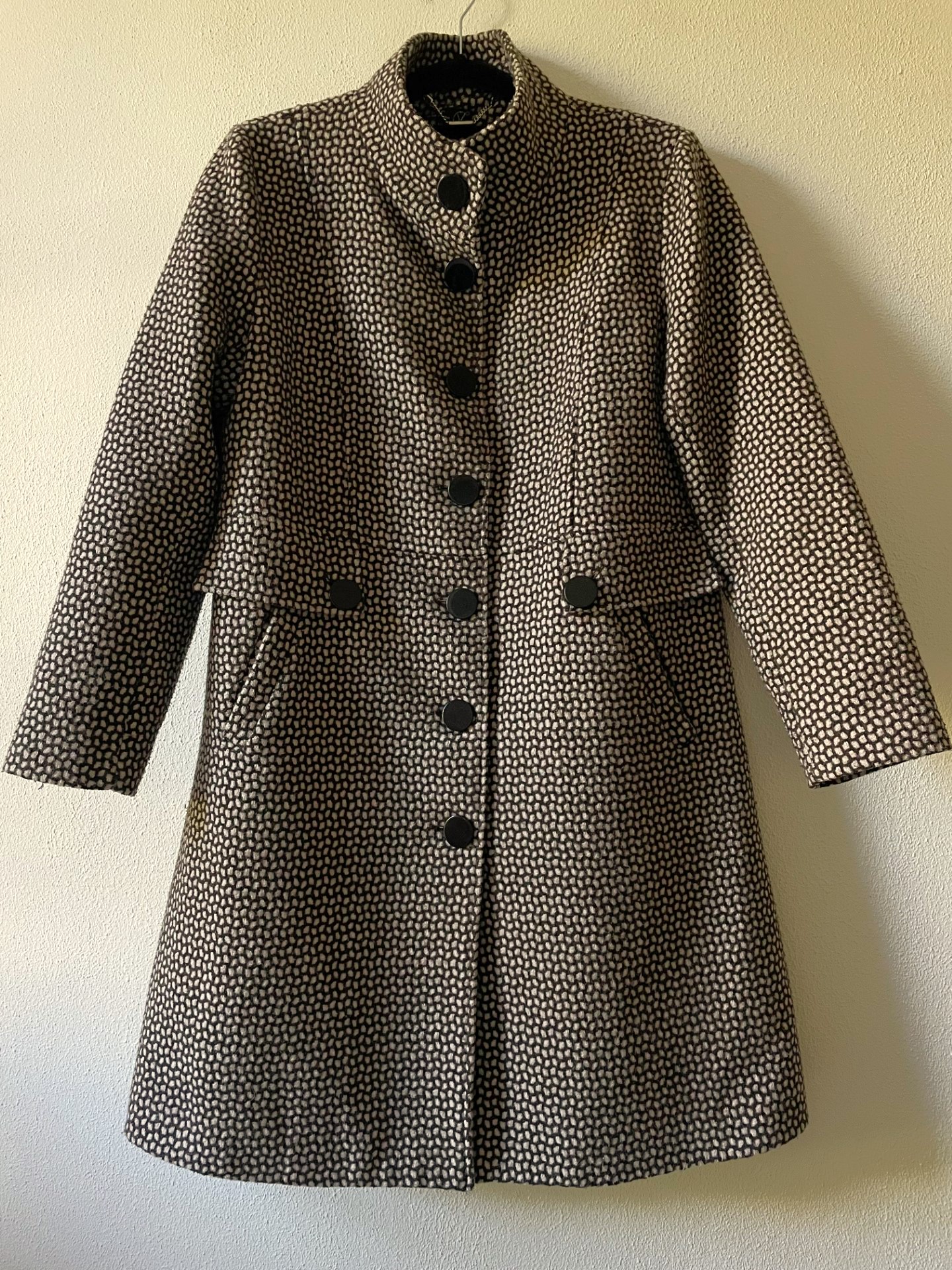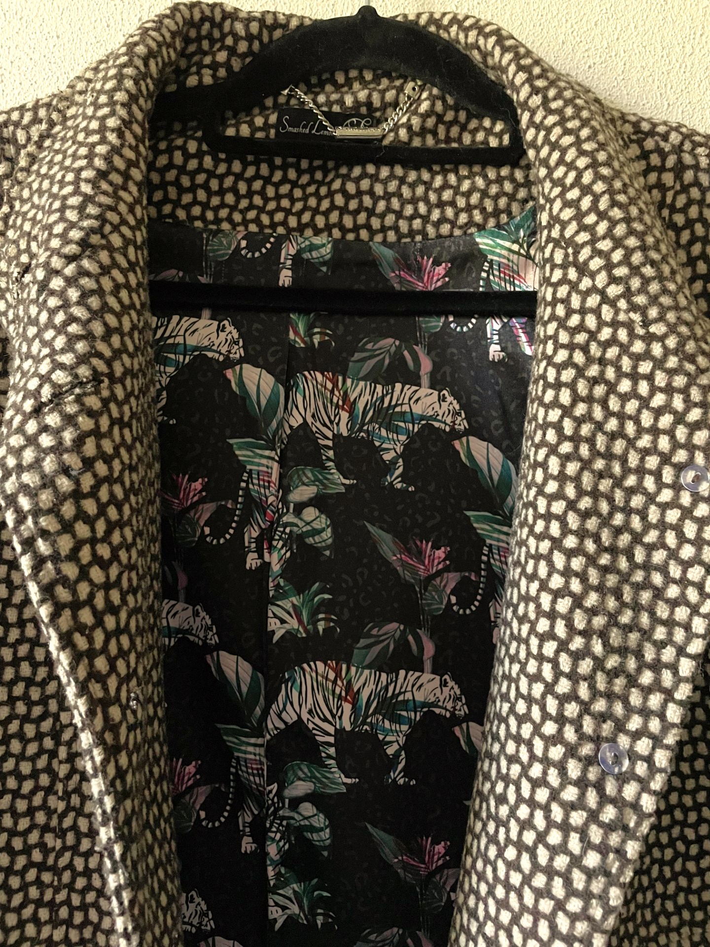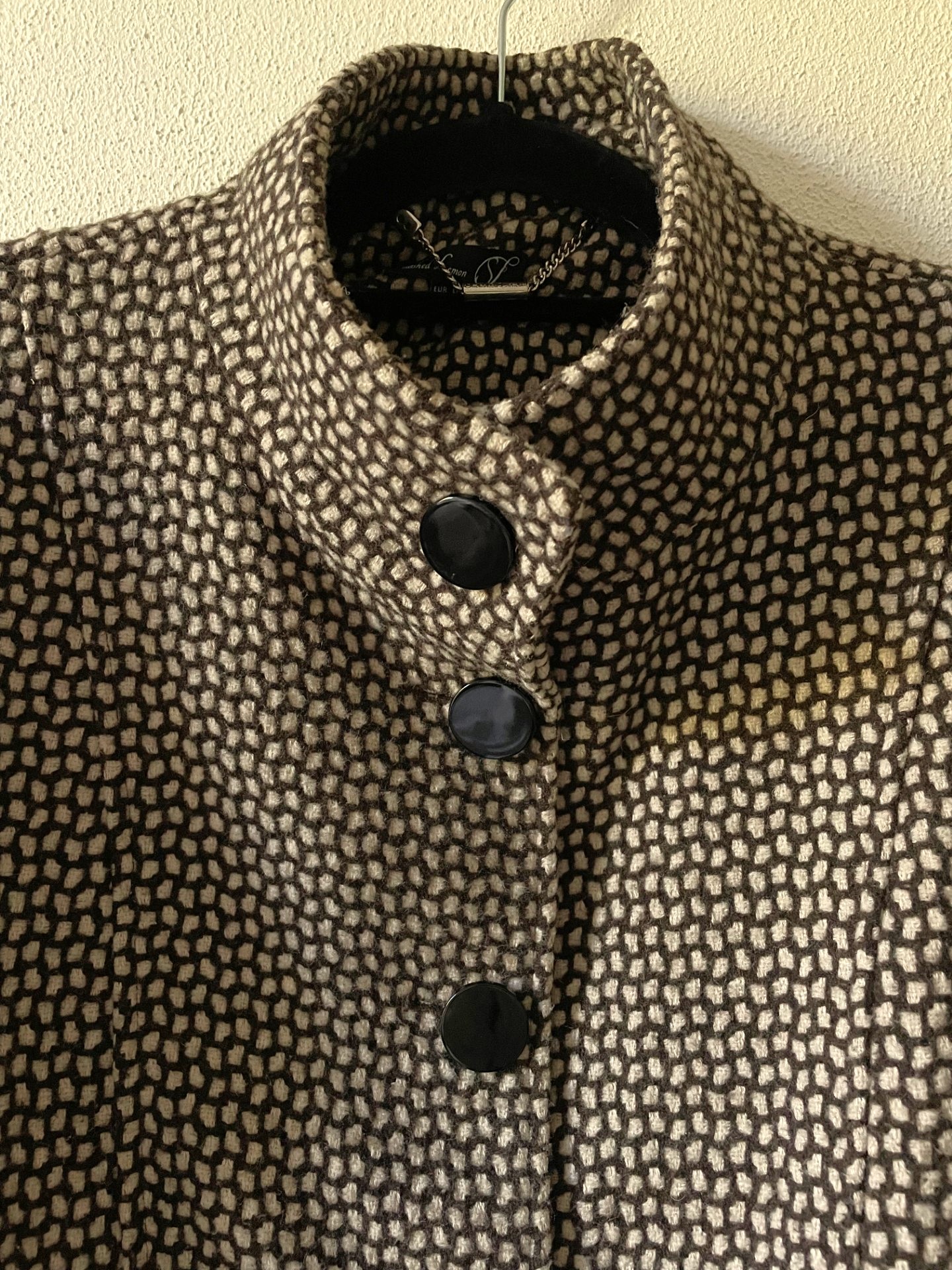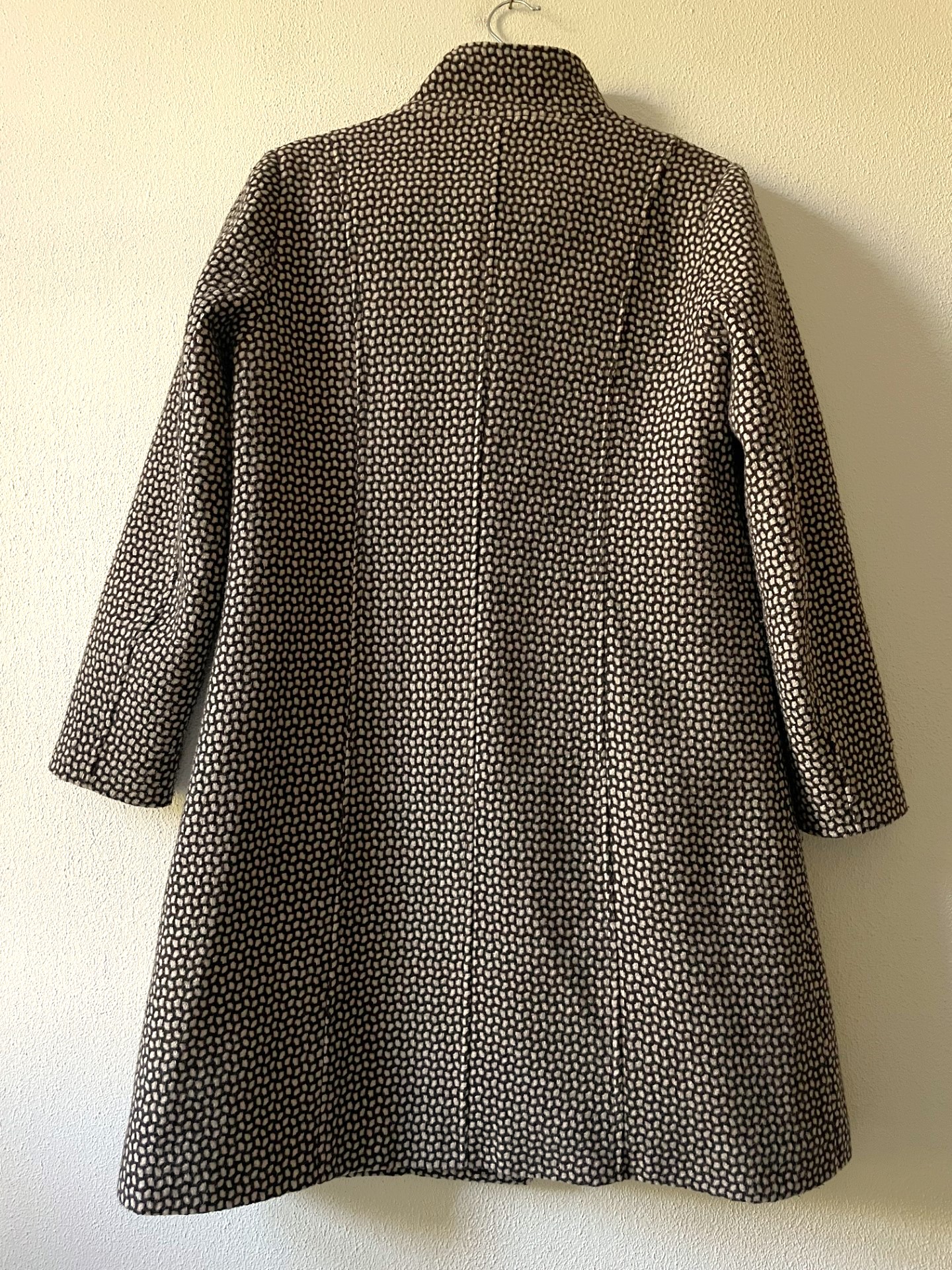 Lange jas in donkerbruine/beige print met hoge sluiting in iets uitlopend model. Prachtige kwaliteit en leuke voering! 90% polyester, 10% wol.