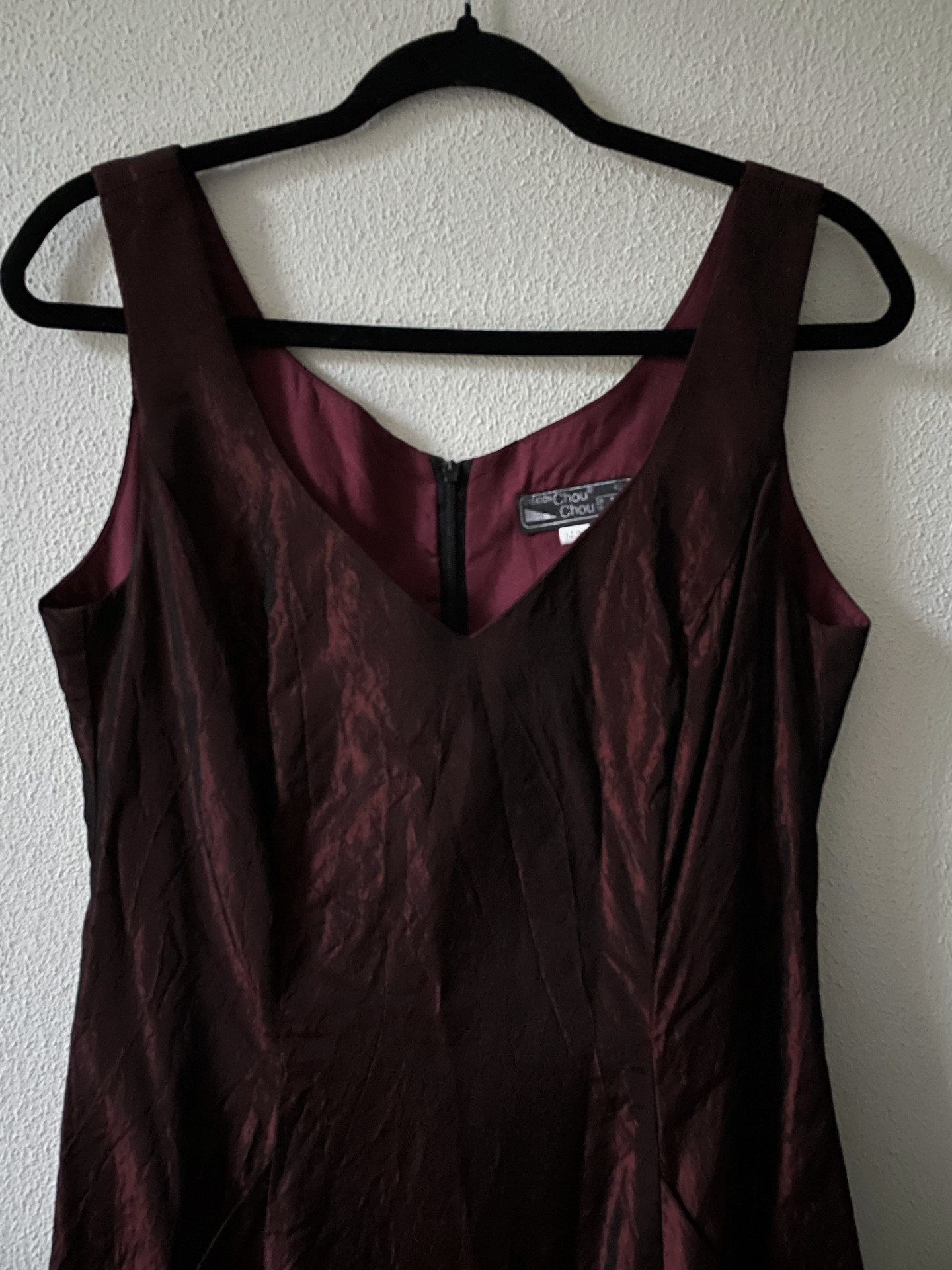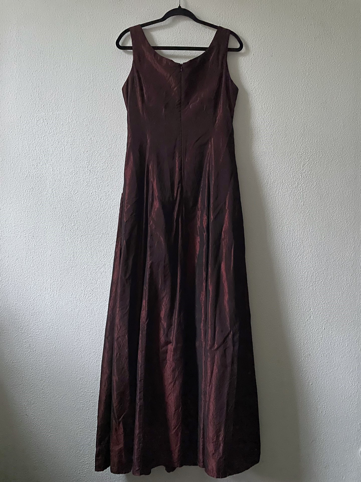Prachtige lange feestelijke jurk van een stevige burgundy taftachtige stof met mooie glans. De jurk heeft een v-hals, steekzakken en is helemaal gevoerd. De lengte vanaf de schouder is 145 cm.