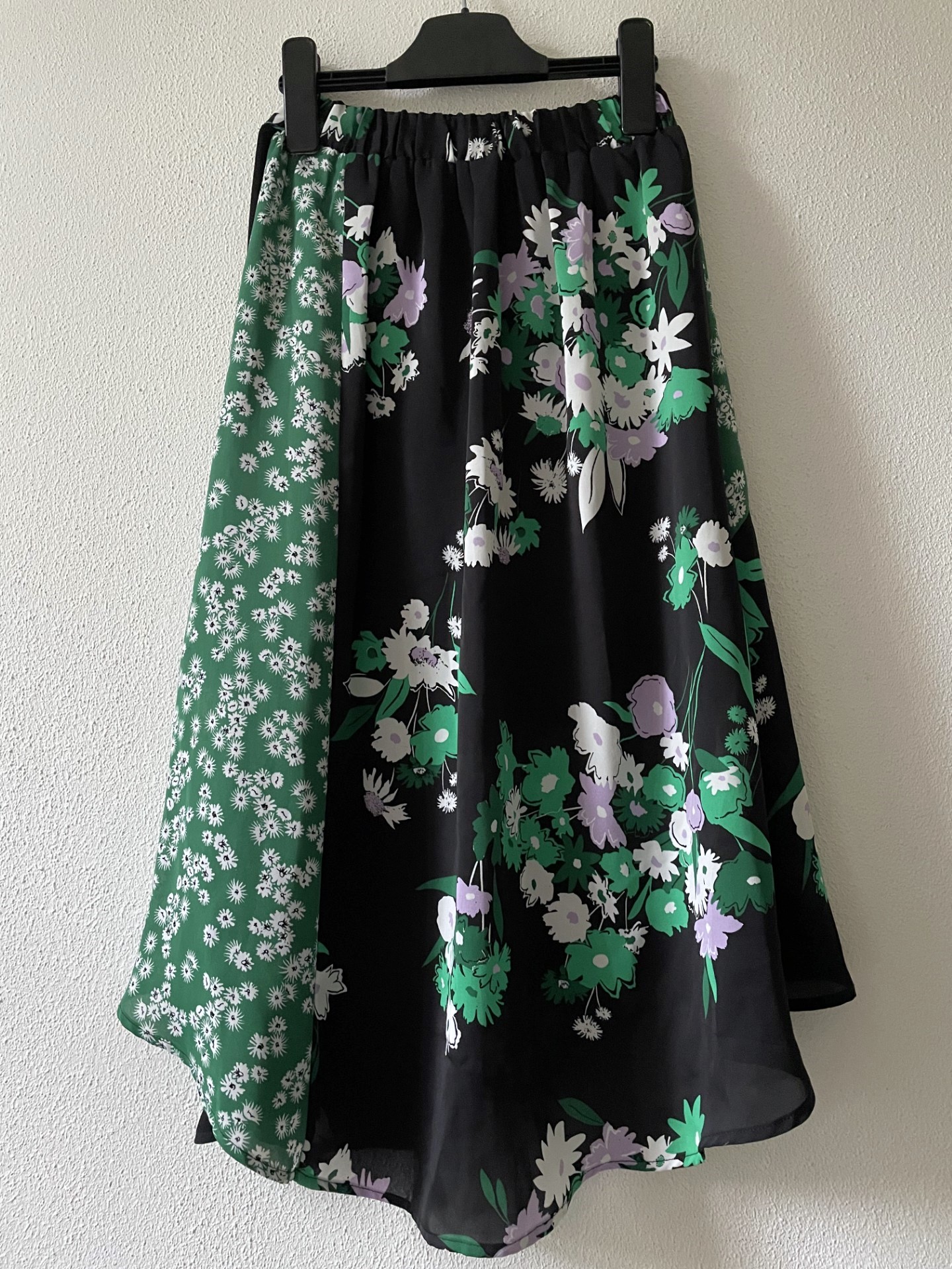 Lange rok met diverse kleuren en prints in uitlopend model. De rok heeft voor in de taille een gladde band en achter elastiek en valt achter glooiend en wat langer. Van een mooie kwaliteit polyester met elastan.