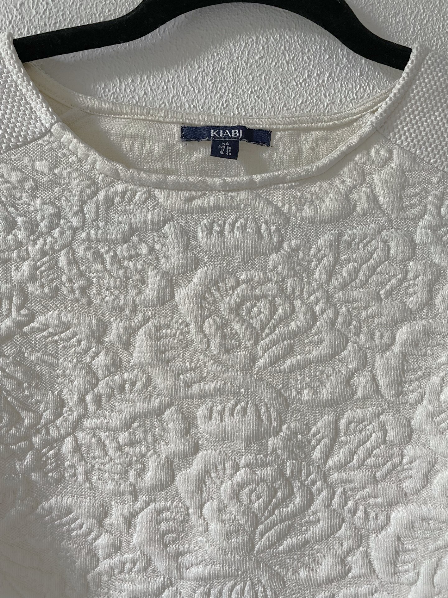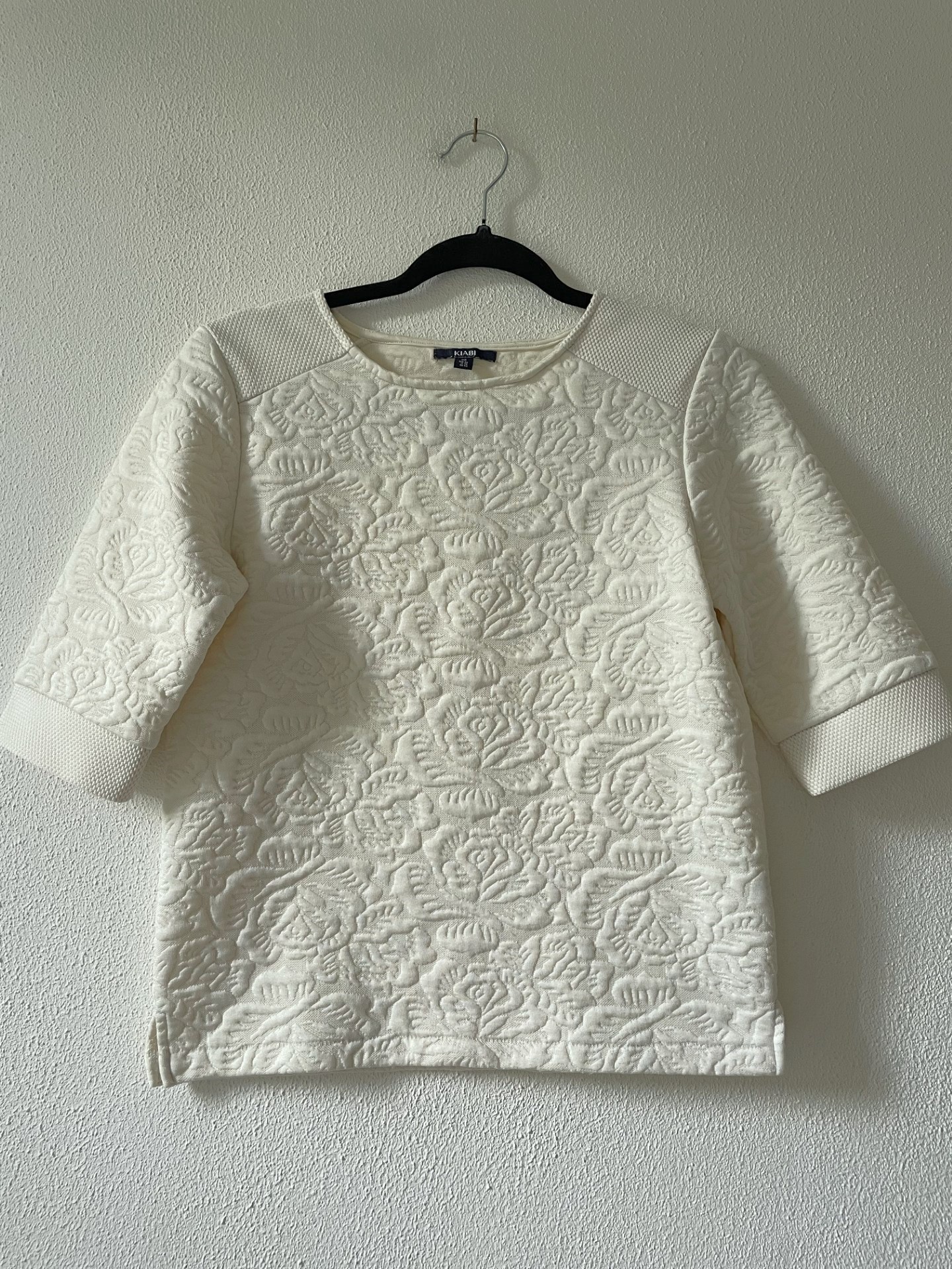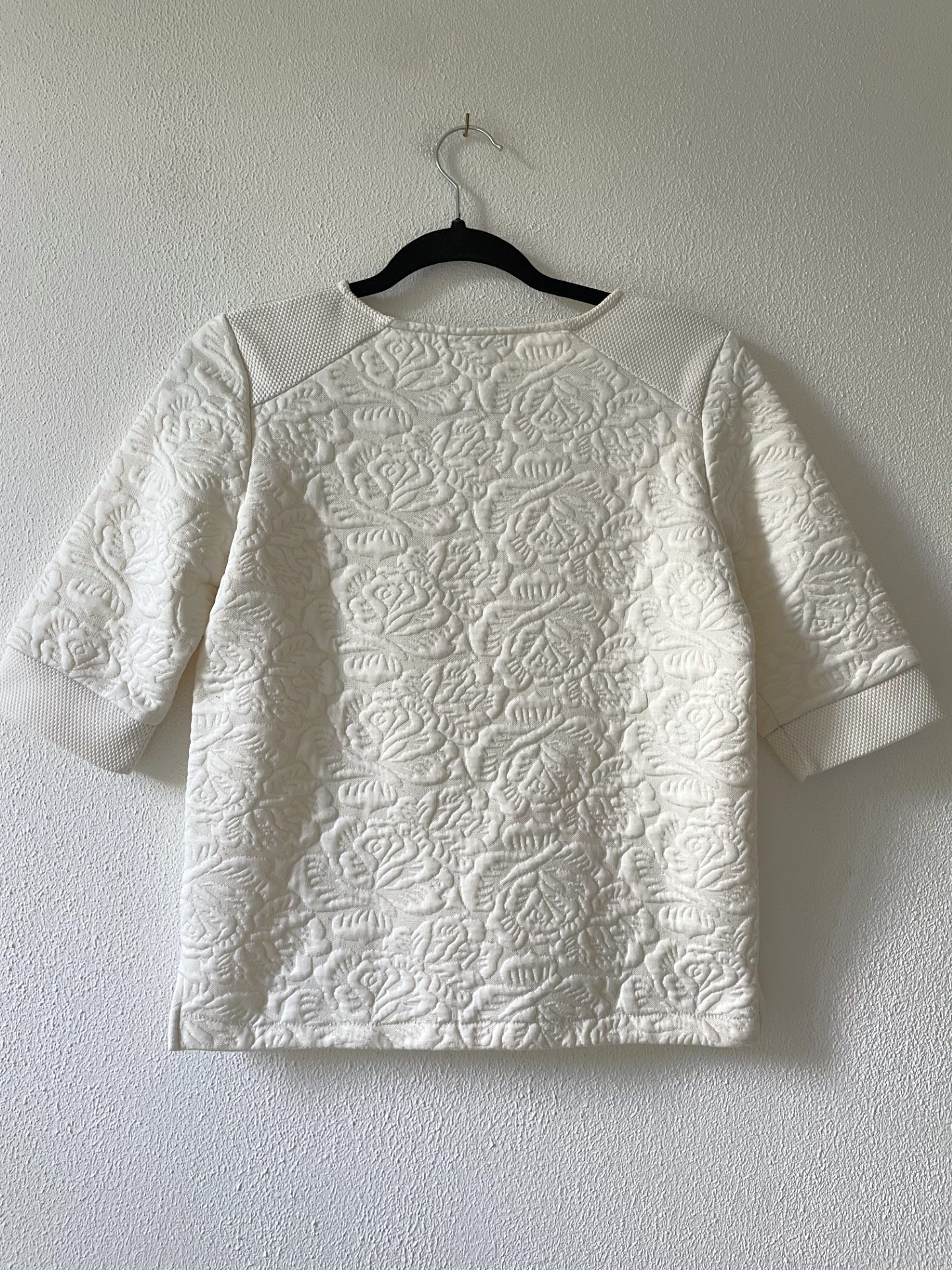 Sweater in offwhite kleur met gebloemde structuur in de stof. De korte mouwen en zijsplitjes zorgen voor een sportieve look!
