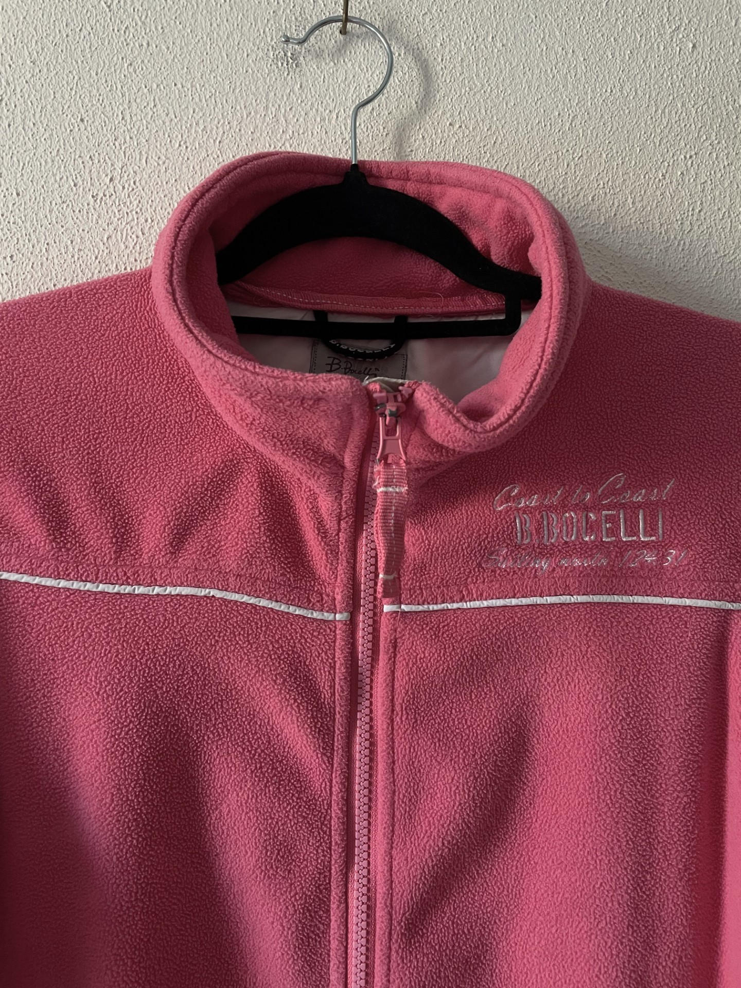 Roze fleecevest met ritszakken en ritssluiting. 100% polyester.