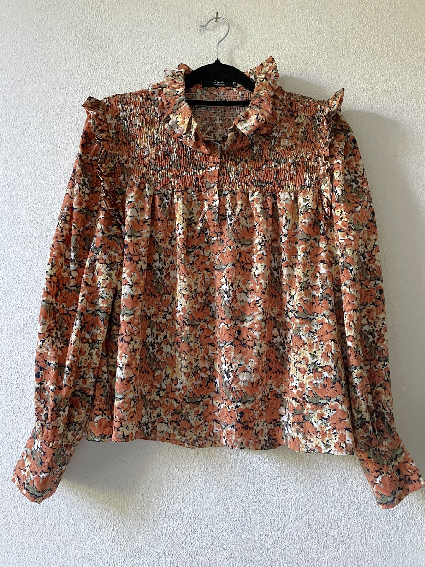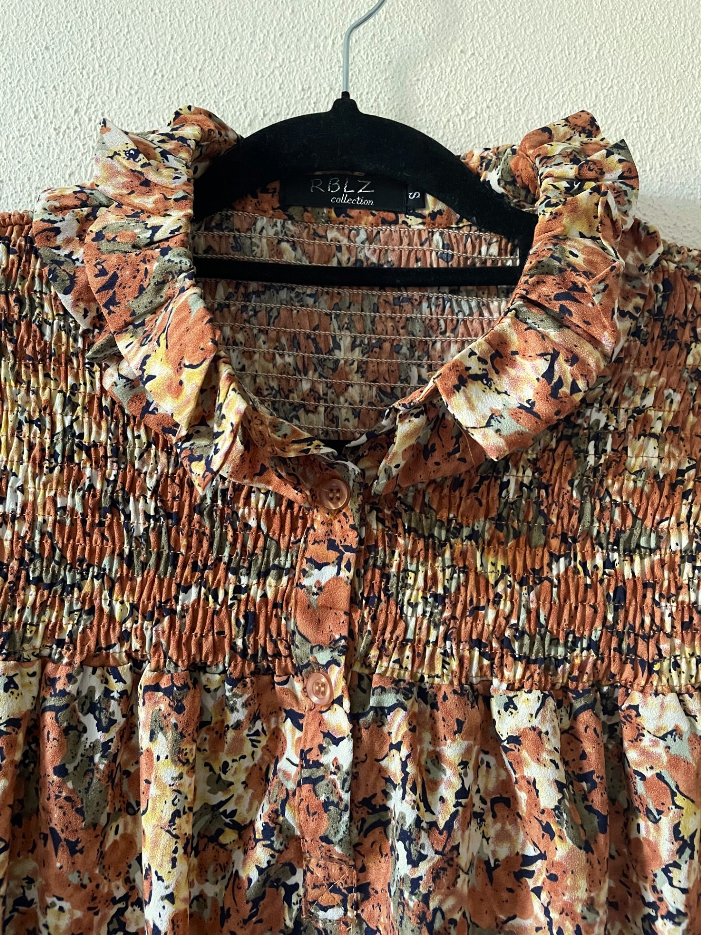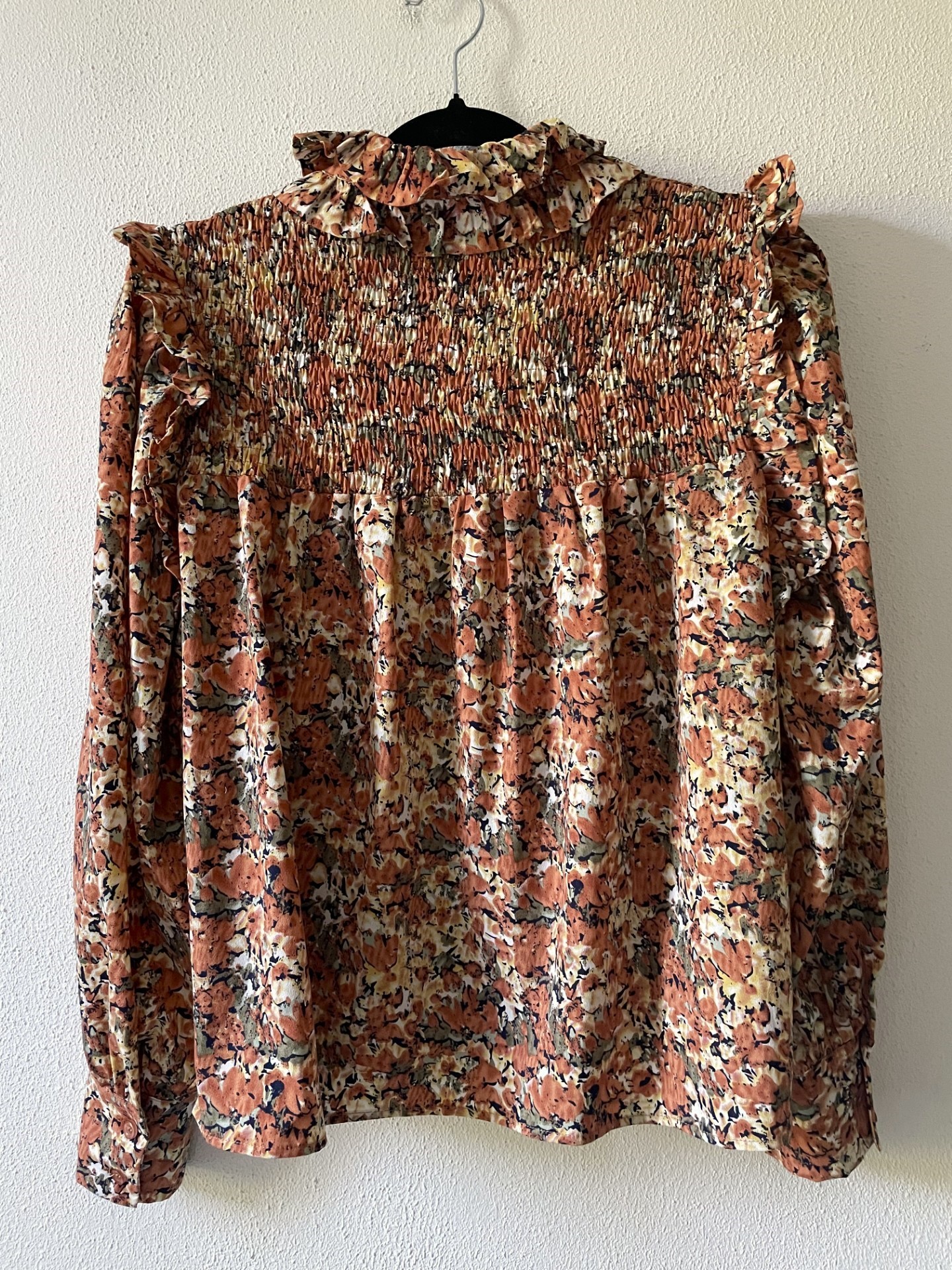 Blouse met sierlijke ruches op de schouders en dubbele rij langs de kraag, gesmokte bovenkant in wijd model van een cognac/bruin/groene kleur. Maatlabel geeft een S aan maar valt als een S/M.