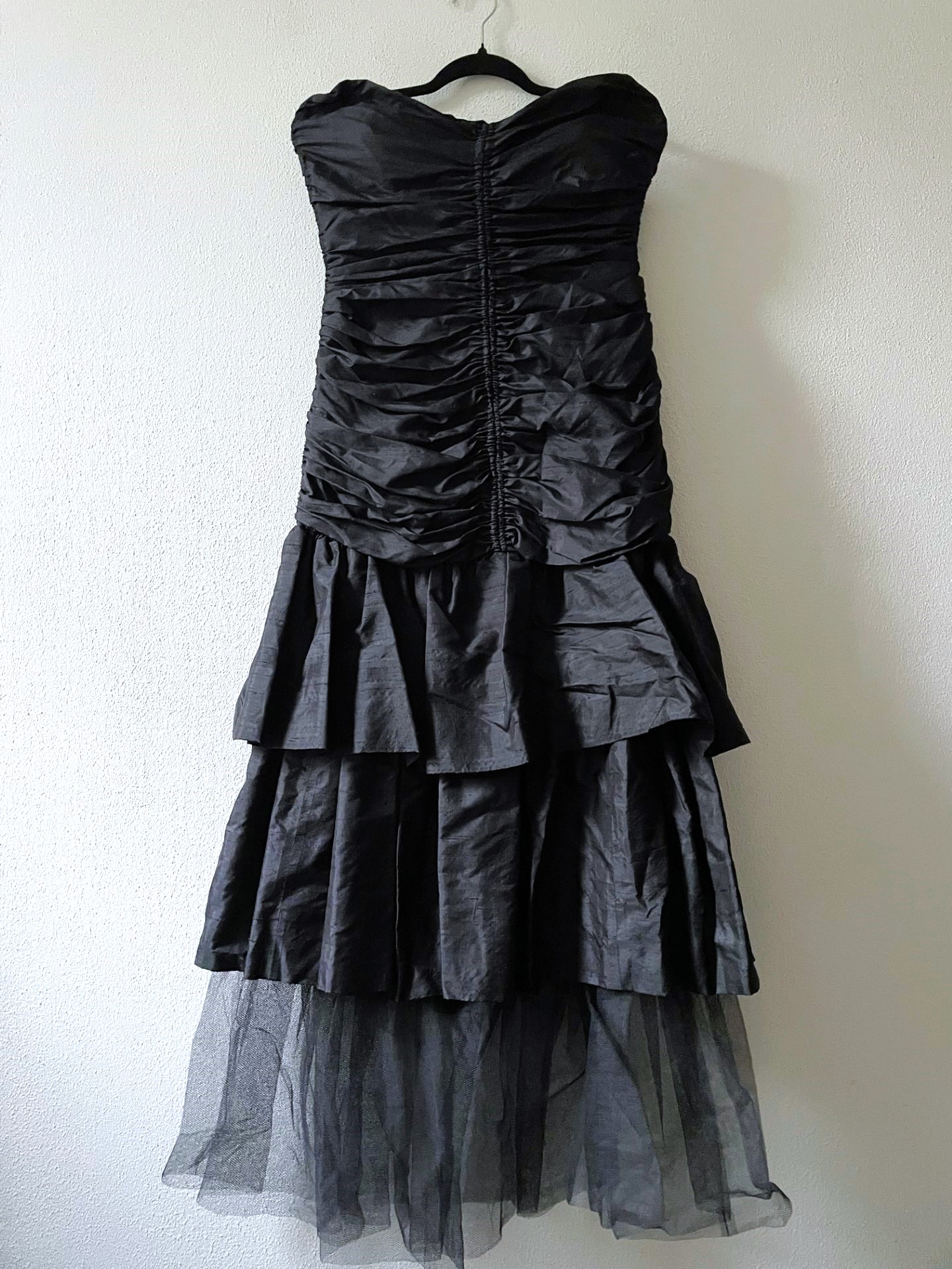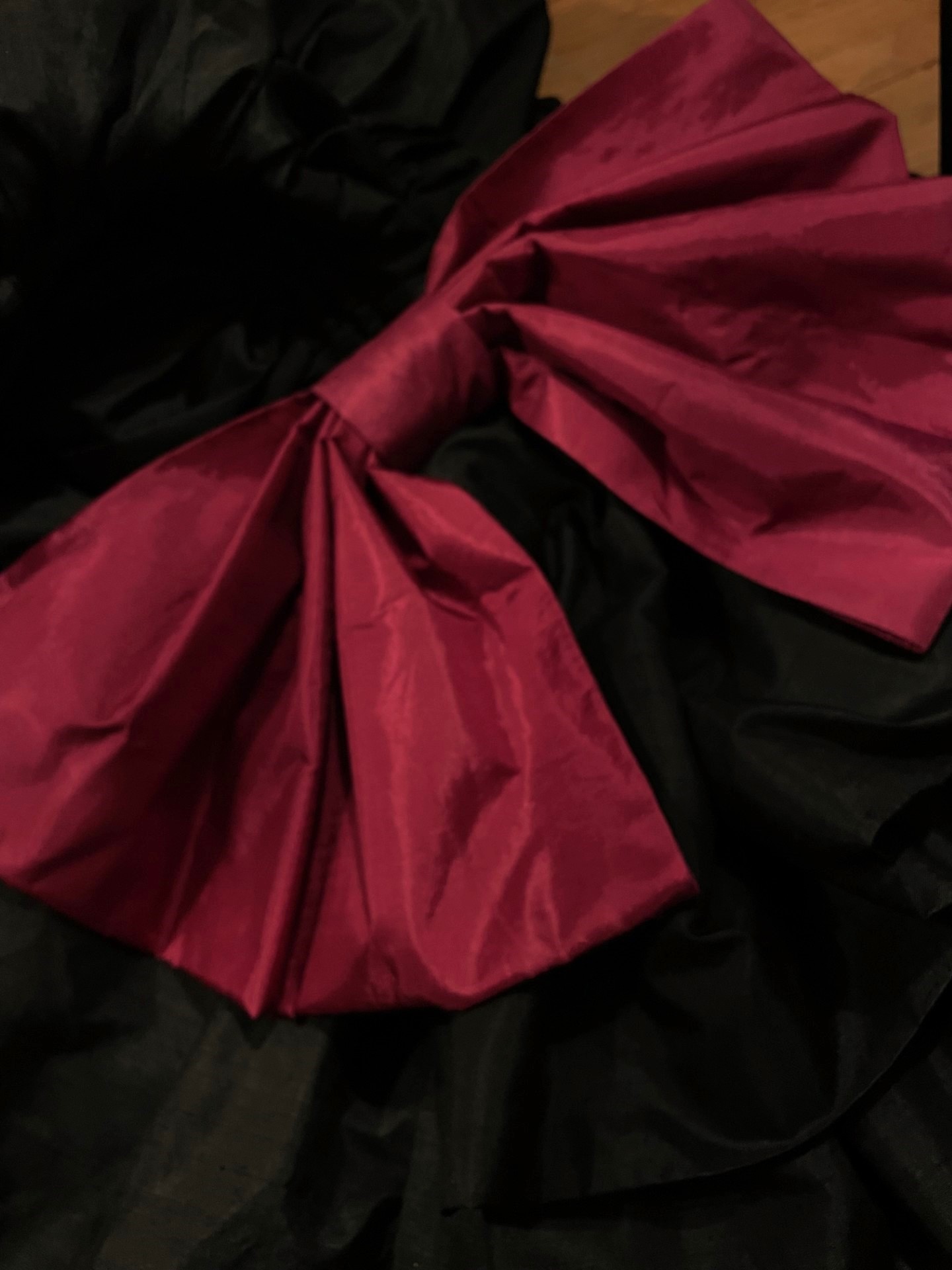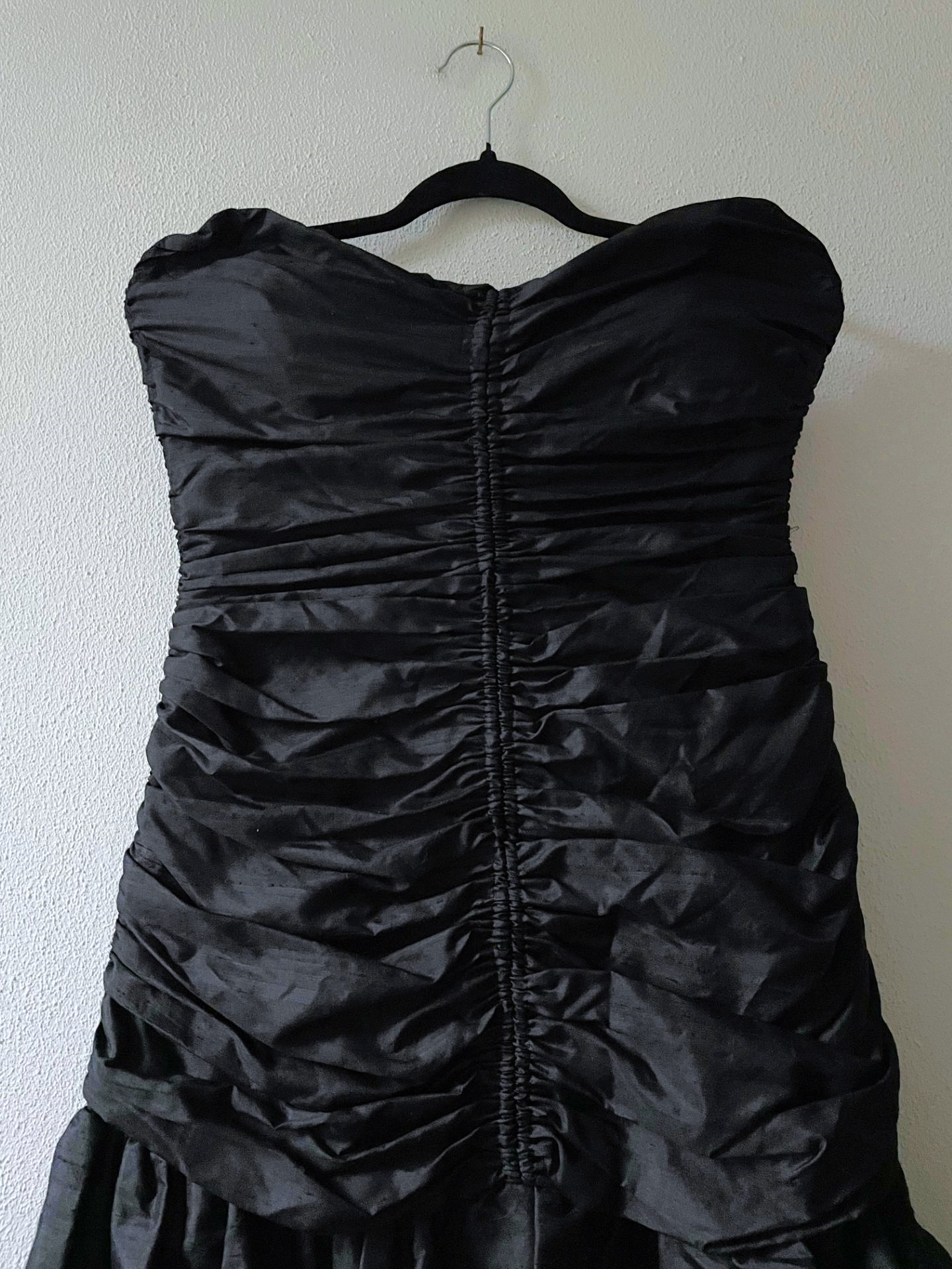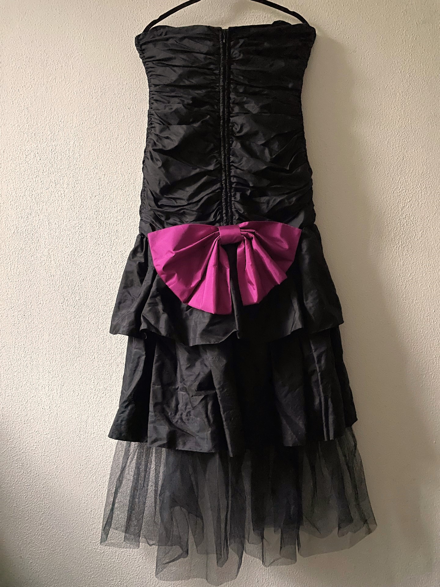 Prachtige strapless jurk met gerimpeld lijf en grote strik achter. De kleur van de strik is meer frambozenroze/rood, zie close up foto. De jurk is van mooi zacht licht glanzend taftzijde met onderaan de voering tule. Super feestelijk! Er zit geen maatlabel in maar wordt geschat op een XS/S. Borstwijdte is 80 cm, taille 70 cm rondom.