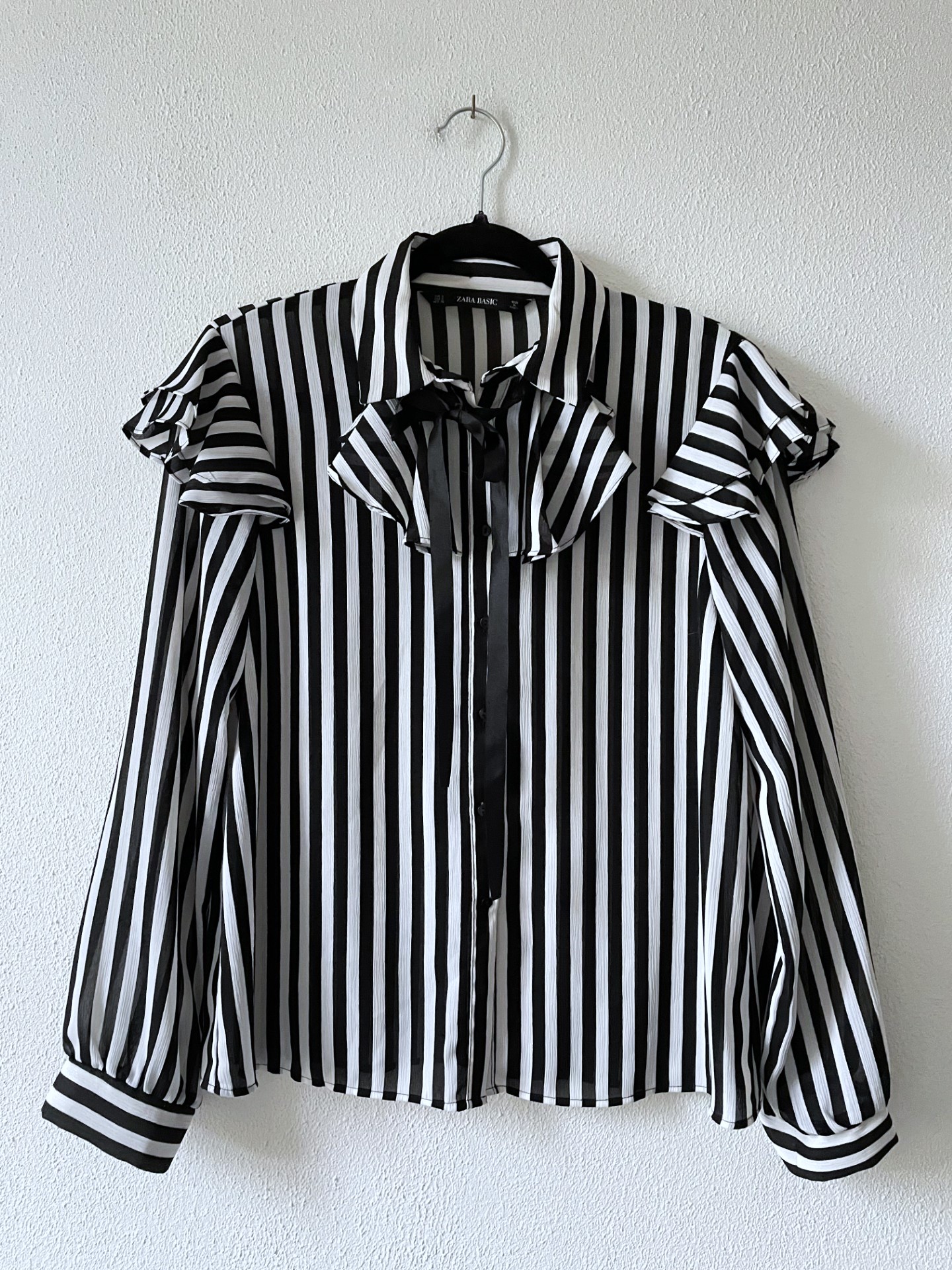 Blouse in zwart/wit streep met leuke details als striklint en volants op de schouders. Maatlabel S maar valt wat ruimer als S/M. Omtrek oksel is 96 cm.