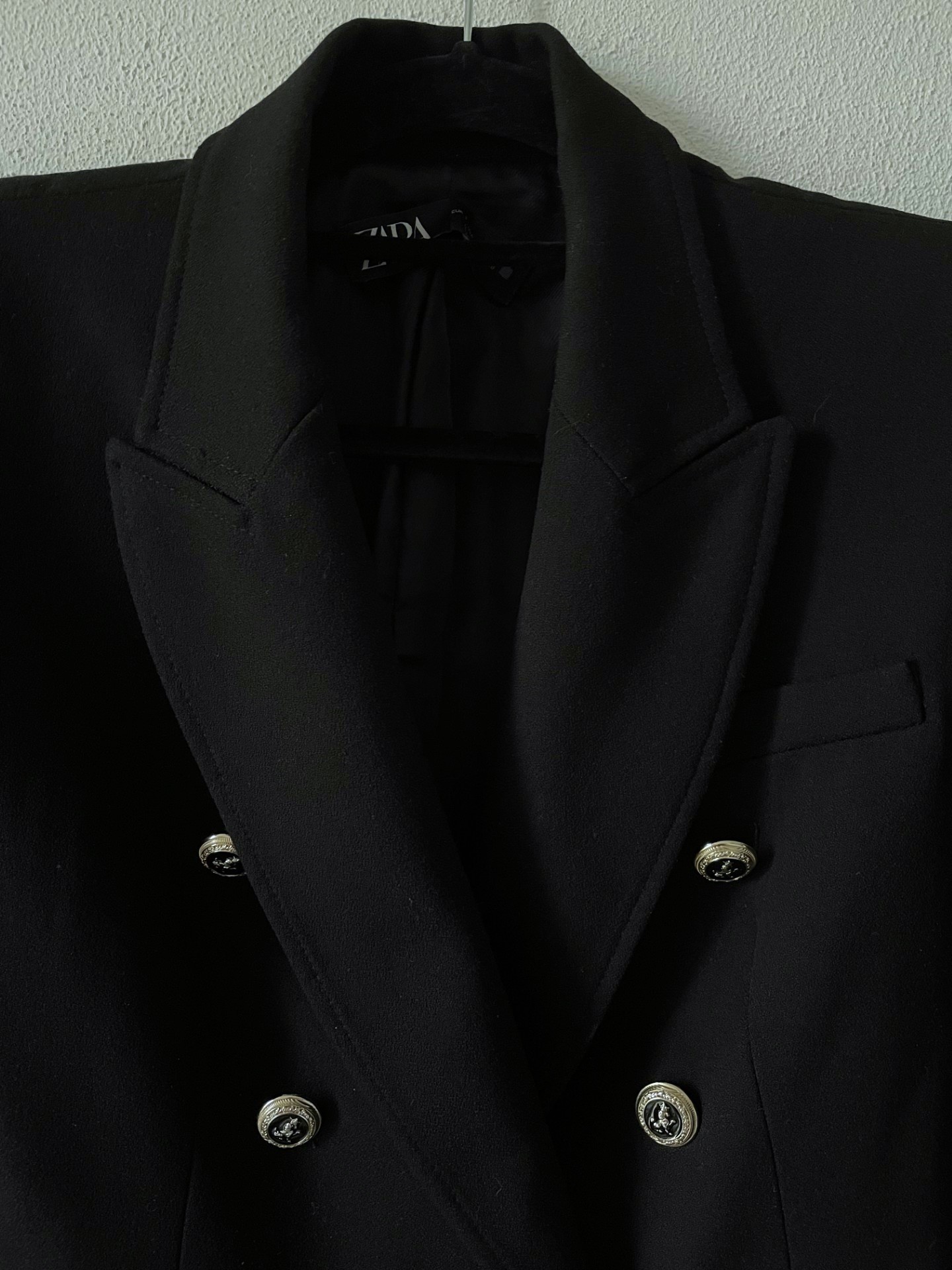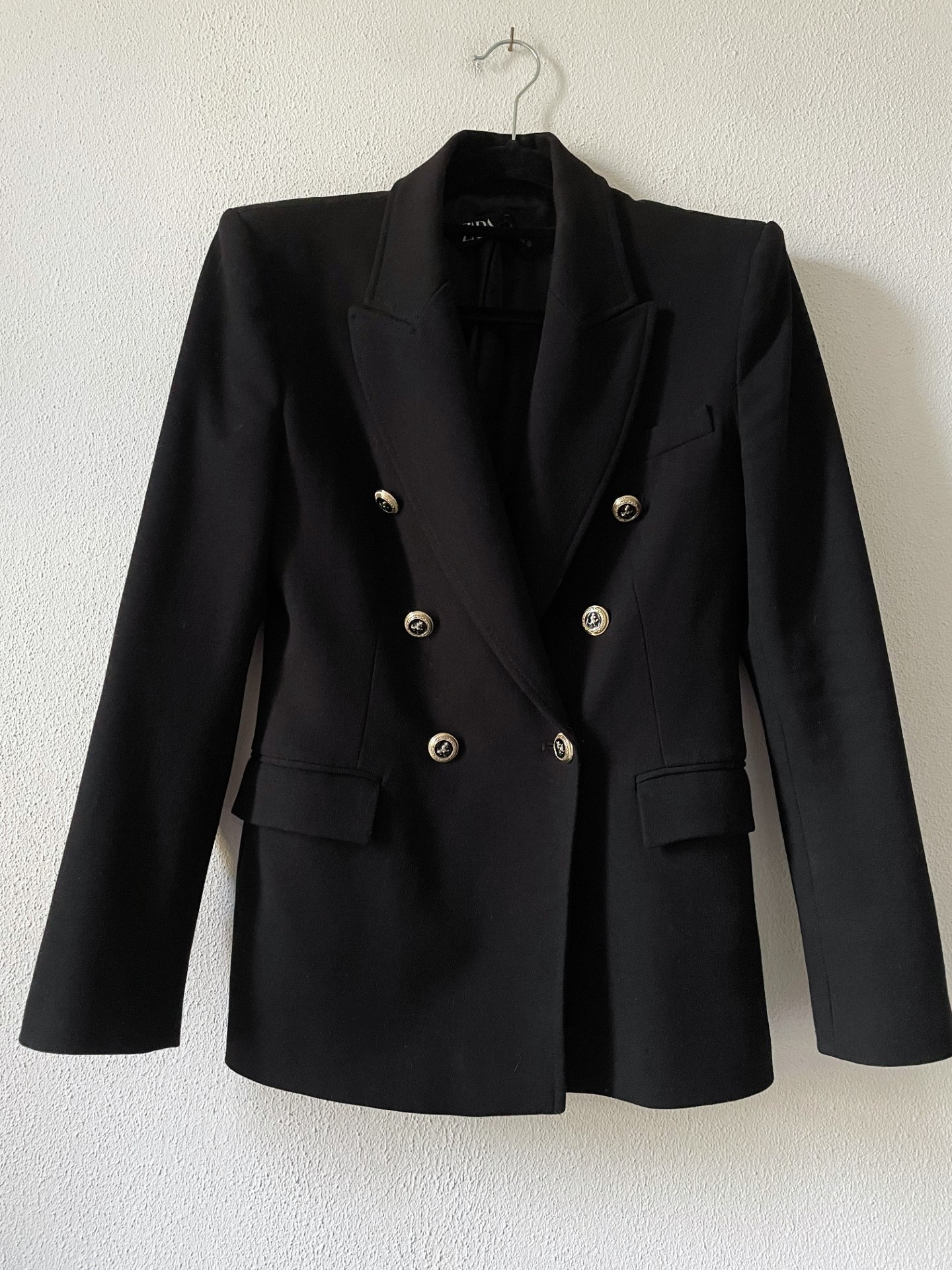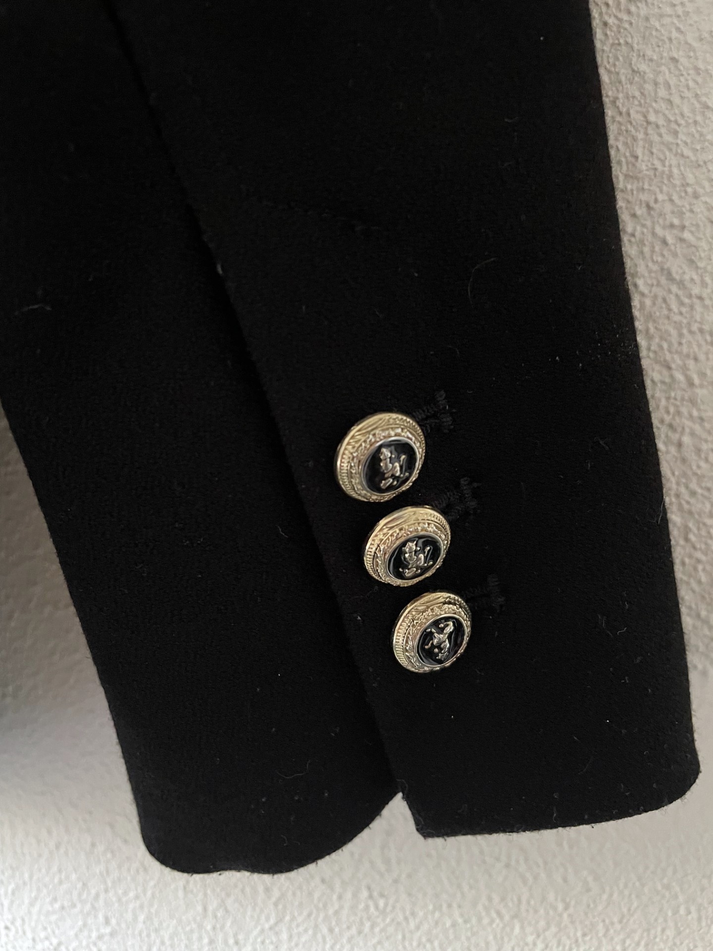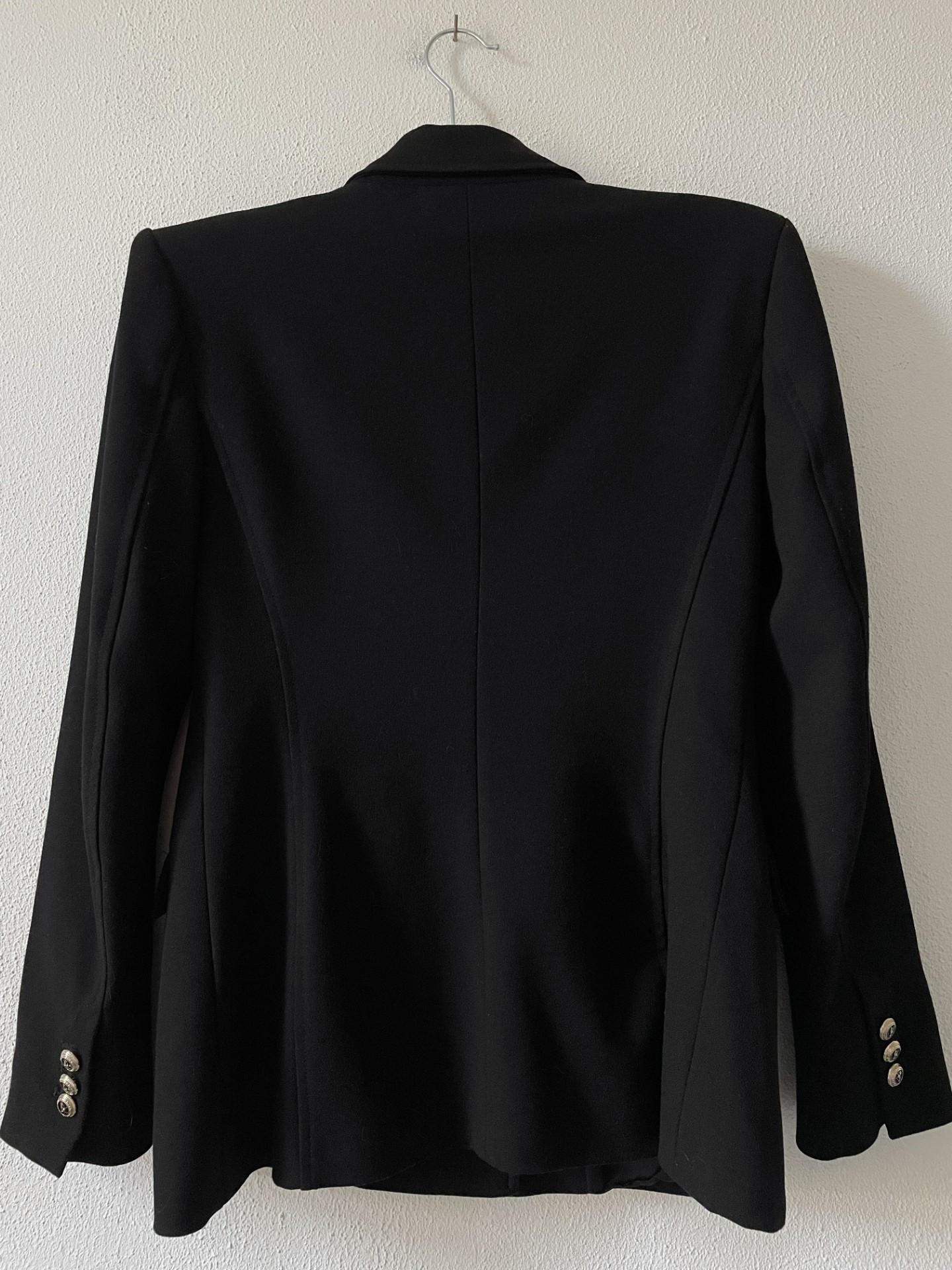 Zwart colbert met mooie dubbele knopenrij en sierlijke knopen op de mouwen, helemaal gevoerd.