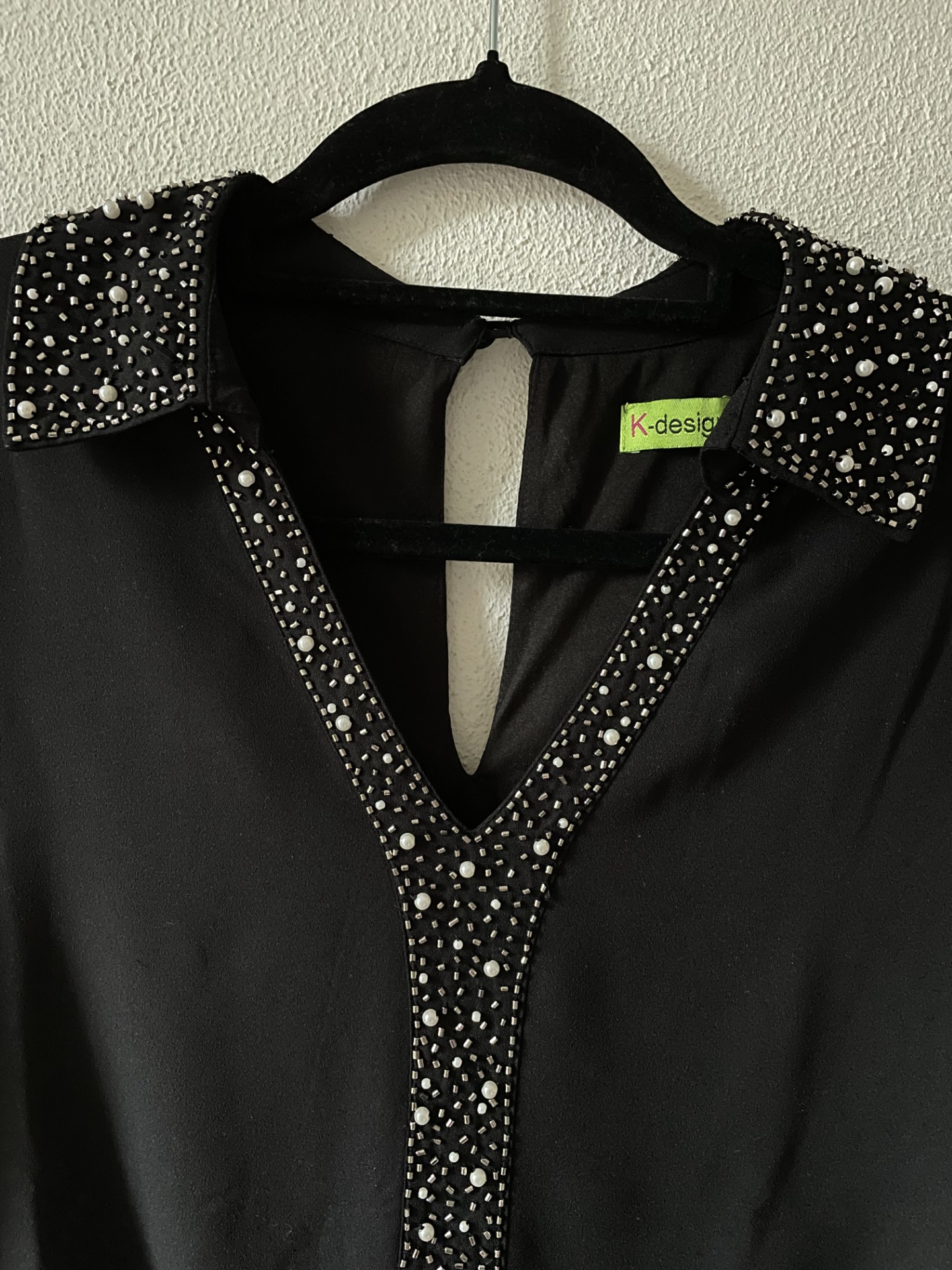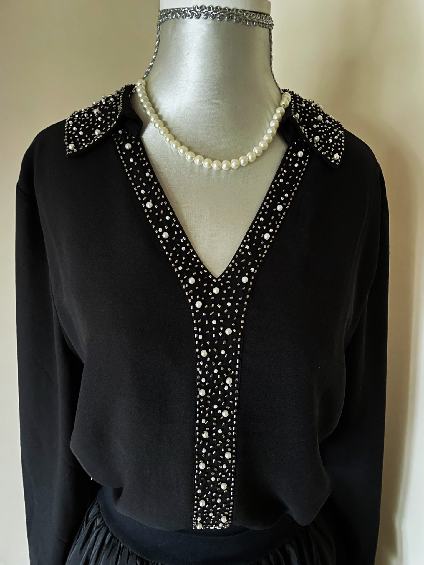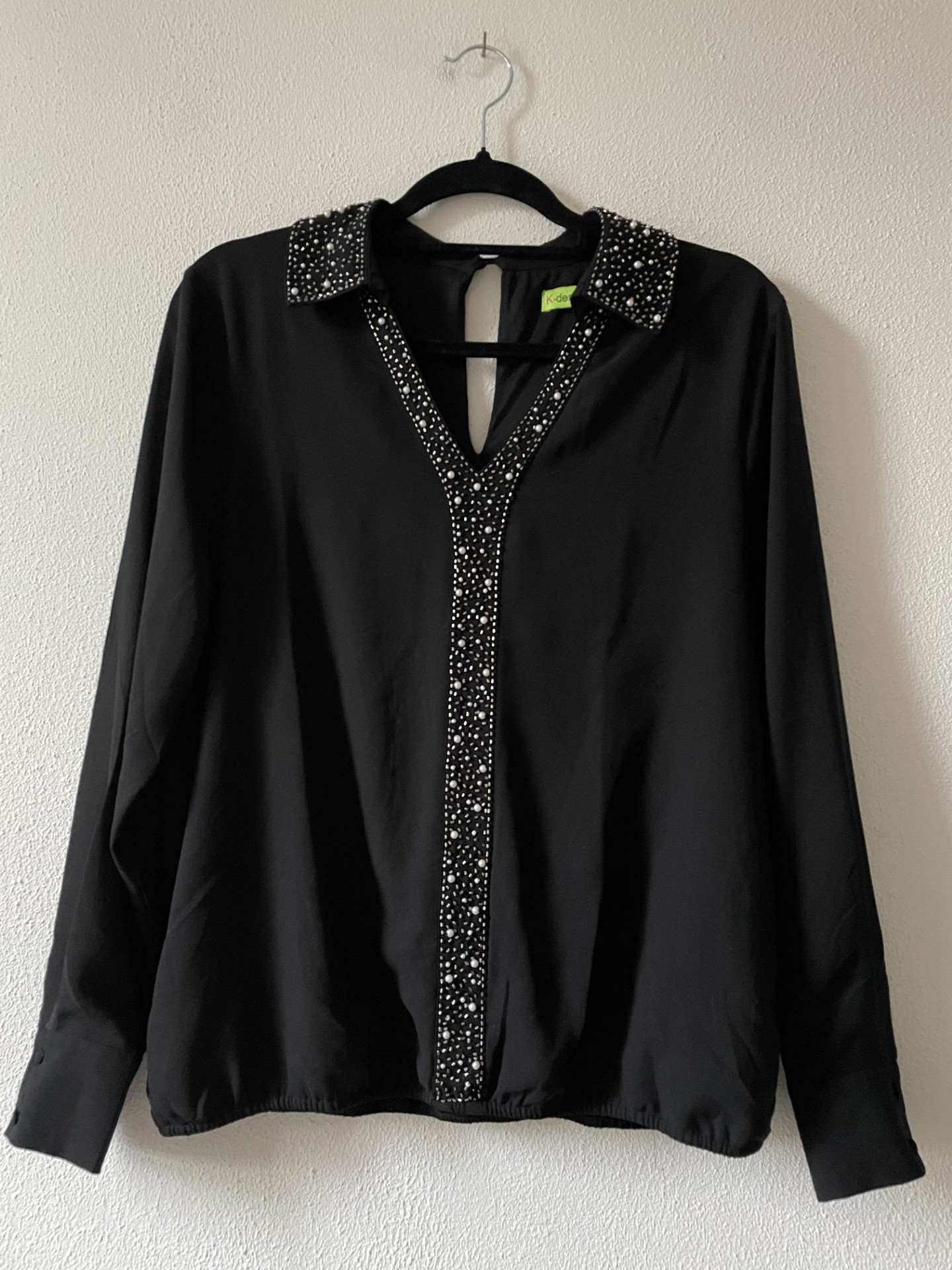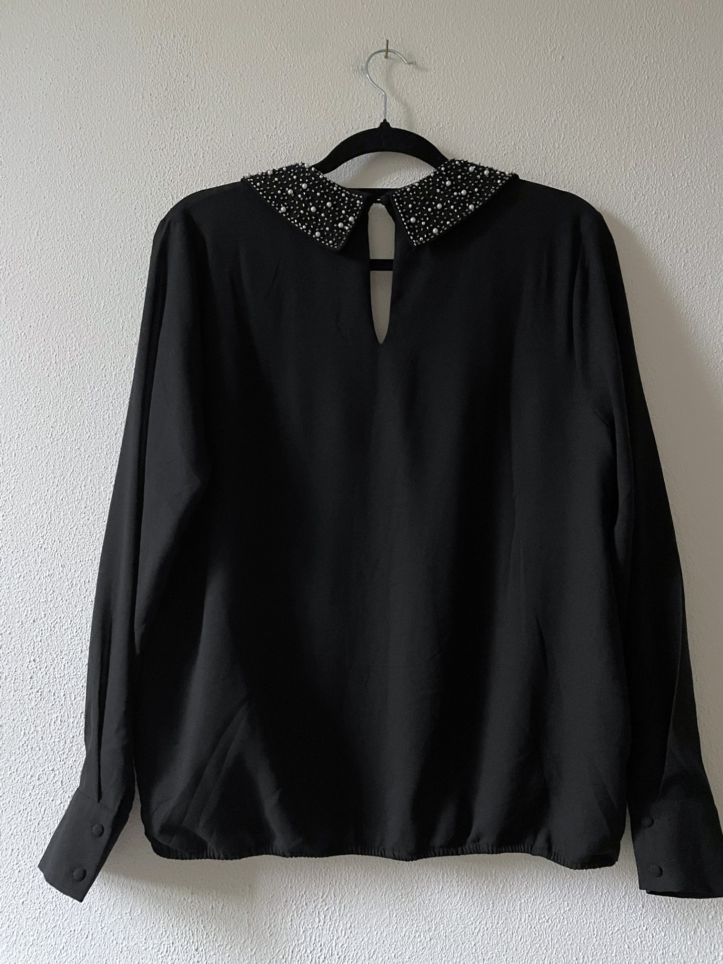 Zwarte blouse van een voile stof met pareltjes, glimmende kraaltjes in de kraag en voor. De blouse valt ruimer (maatlabel S maar valt als S/M) en heeft elastiek onderaan. Een echte eyecatcher!