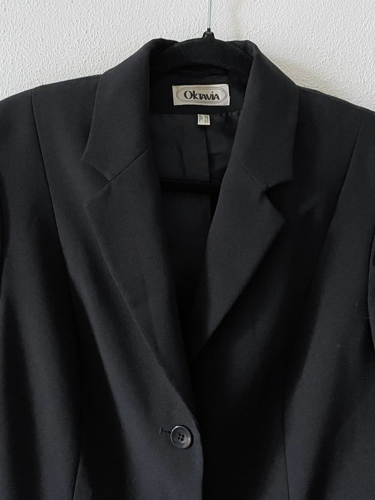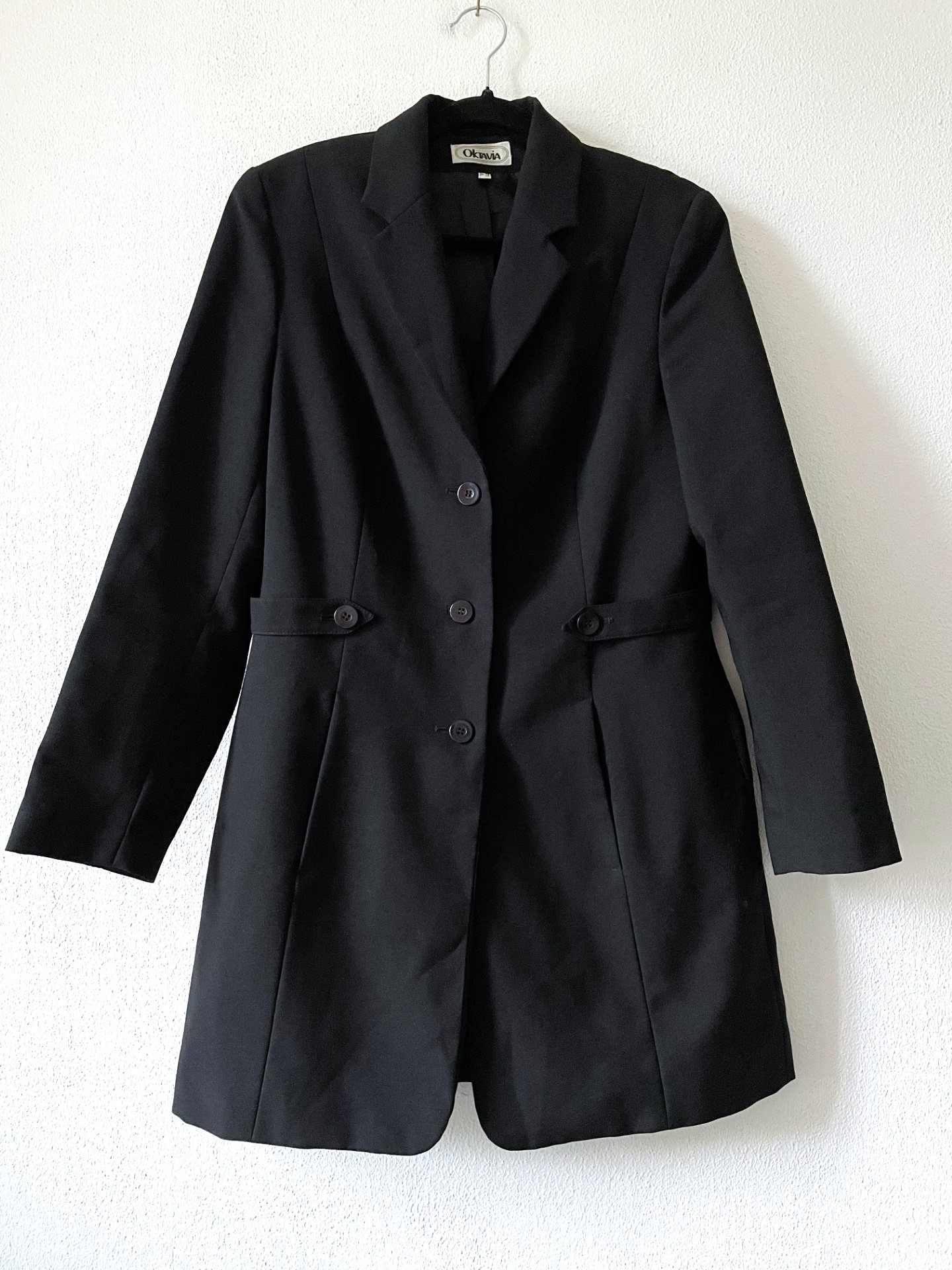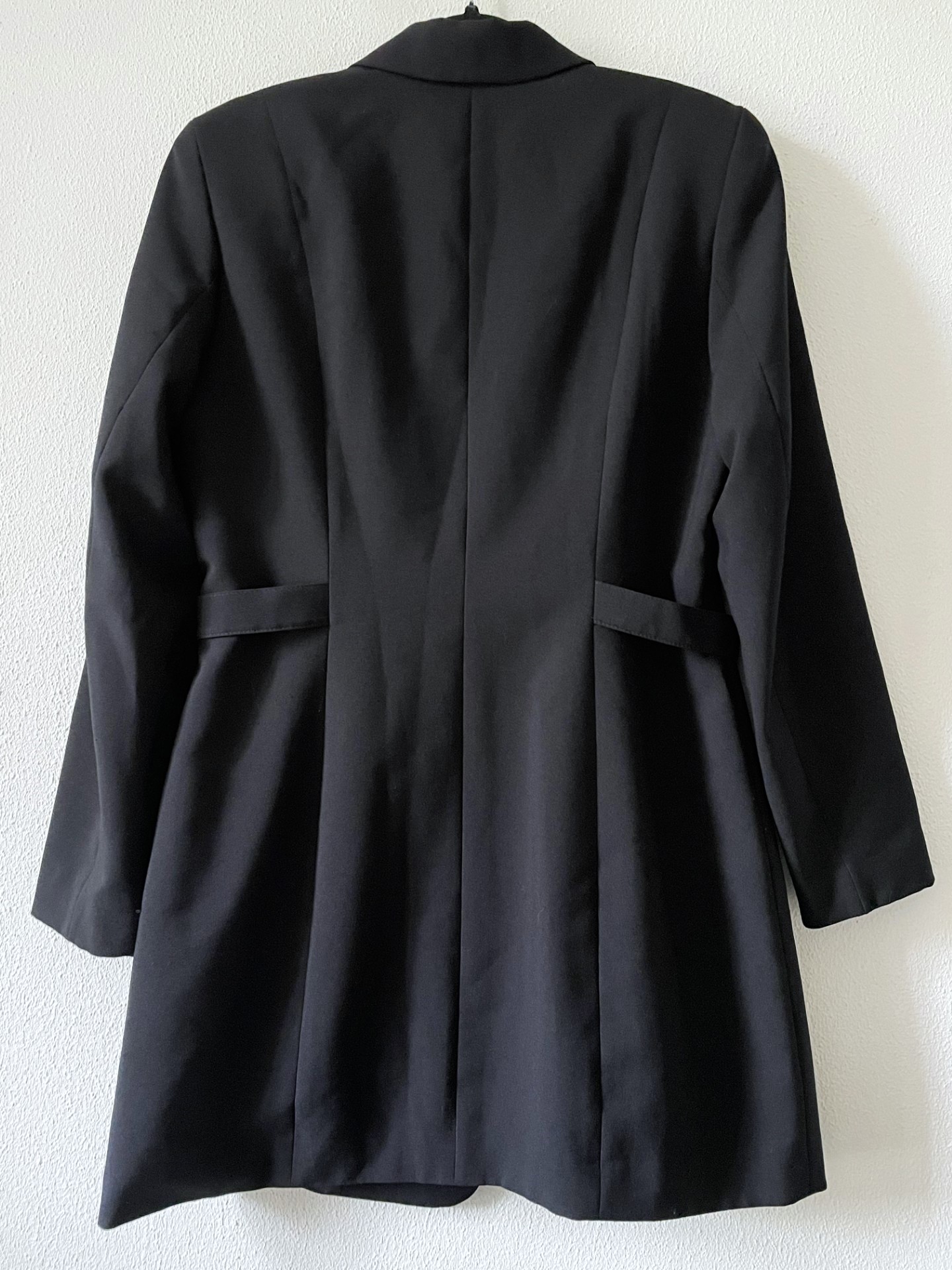 Zwarte colbert die qua lengte als minijurk gedragen kan worden. Lengte is 86cm.