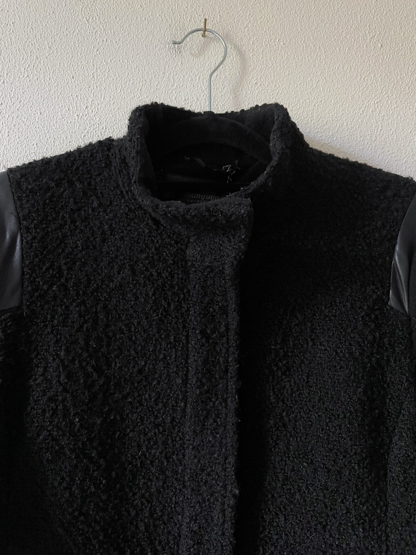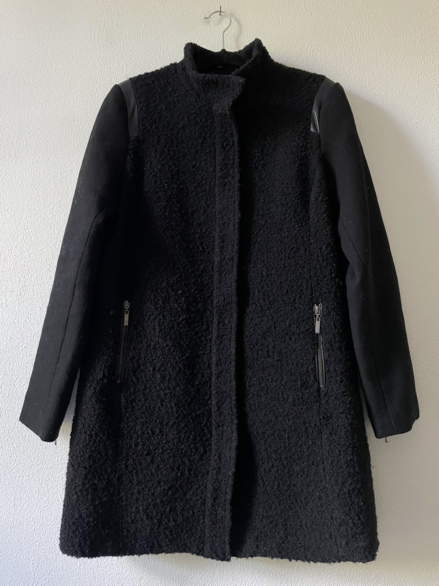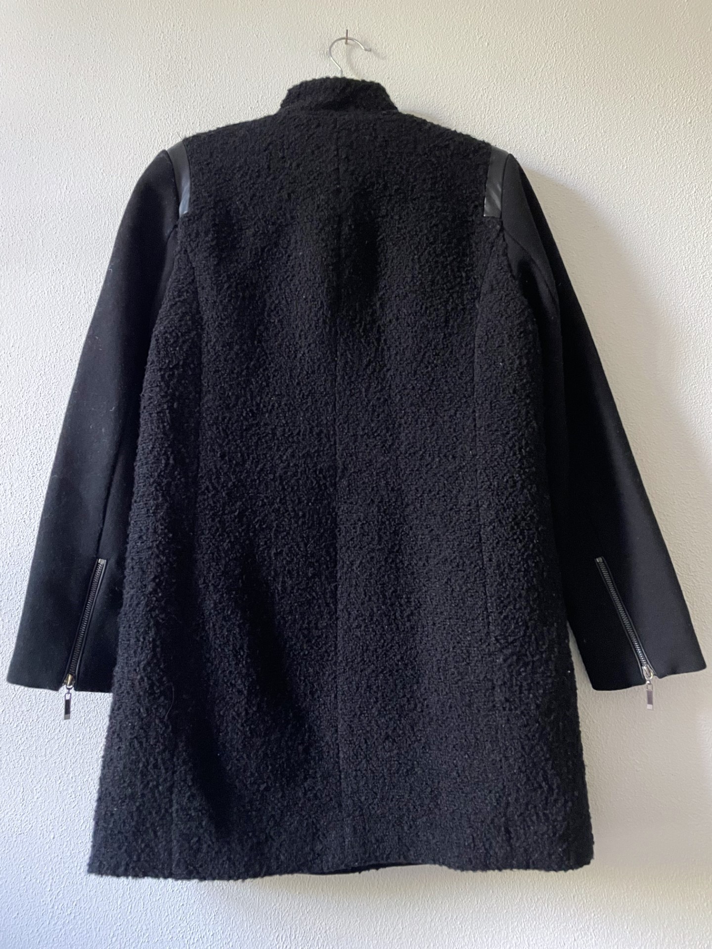 Zwarte halflange jas in verschillende stoffen (wolmix) met hoge sluiting en PU leren details met ritsen in een recht model. Helemaal gevoerd. Valt iets kleiner (38/40).